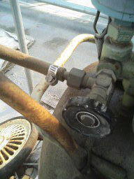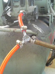 | 外した管へ、買ってきたチューブを取り付け、三角分岐をさせます。 つなぎ目はホースを止める金具等でしっかり固定します。 ・分岐部品 約400円 ・圧力チューブ10cm 50円 ・金具 1ヶ 98円 すべて、ホームセンターにて揃います。 |