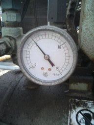 | 只今の圧力は5kg/cm2です。 最大圧力は、7kg/cm2 動作差圧は、2kg/cm2 古い圧力計なので、単位がkg/cm2になっています。 現在はほとんどの圧力計がMPa(メガパスカル)となっています。 ここでの5kg/cm2は約0.5MPaということですね。 |