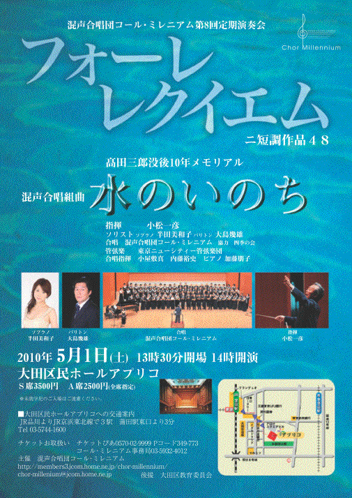 指揮は2005年にトーマス版による初演の指揮をとった小松一彦氏、またピアノには高田三郎氏長女の高田江里さんをお迎えした。弦楽伴奏の柔らかなハーモニーにのって歌われる合唱は圧巻で、会場からは「ブラボー!」の声が上がった。今後小・中規模の合唱団による「水のいのち」の上演に、この弦楽+ピアノ伴奏版は特にふさわしいのではないか・・と予感させる素晴らしい演奏会であった。