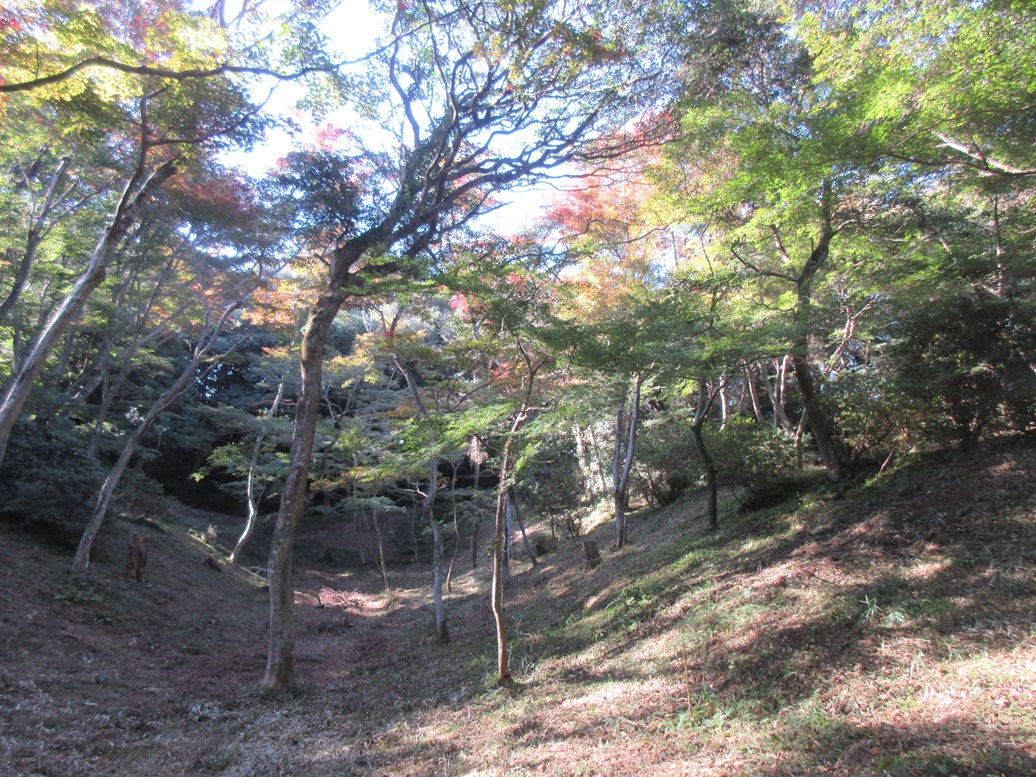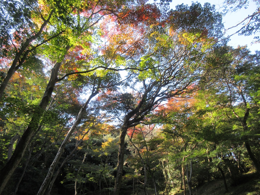<令和7年の紅葉情報> 1 令和7年11月19日(水)現在の、紅葉谷の状況です。まだ、上部の2,3分のみの紅葉です。