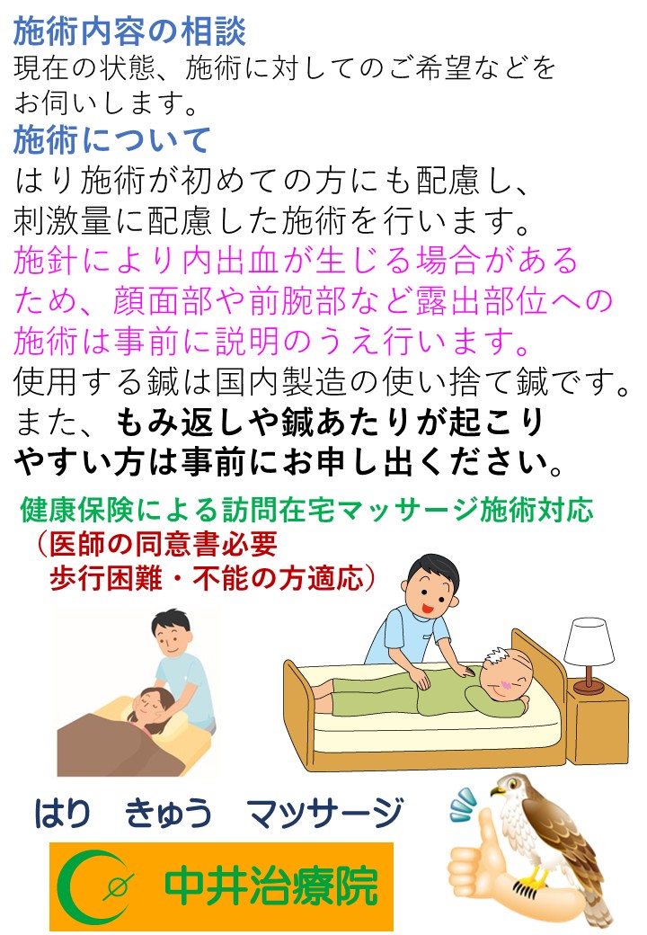 はり・きゅう・マッサージを初めて受ける方は施術後に目まい、筋肉痛、だるさ、のぼせ、発熱などの症状が出る場合があります。施術に慣れるまでは、短い時間で弱めの刺激での施術をこちら側からご提案させていただきます。ご理解のほどよろしくお願いいたします。