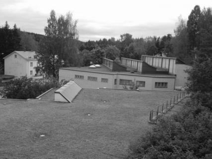 中部フィンランド博物館の1階の屋根(芝張り)の向こうに見えるアアルト博物館のトップライト(2013.7.19)