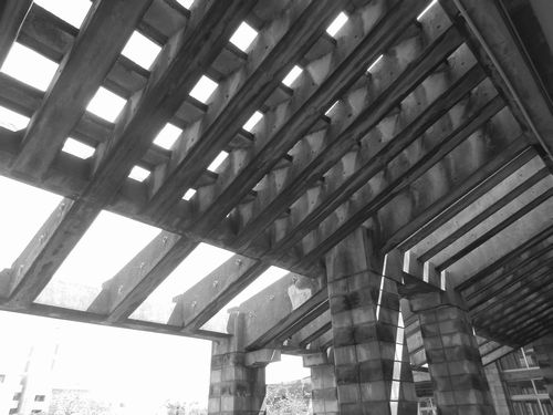 柱梁の格子の上に寄棟屋根が乗っています (2022.11.18)
