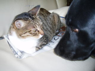 二匹で仲良く遊ぶこともありますが、すぐけんかになります。 この日も、ねこが休んでいるところに、犬があそぼ!といってきましたが、ゆっくりしたいんだわ、じゃまだあと、ねこが怒り始めました。