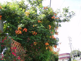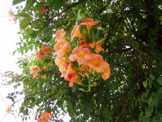 ノウゼンカズラの花がたくさん咲きました。柿木にまきついて覆ってしまいました。
