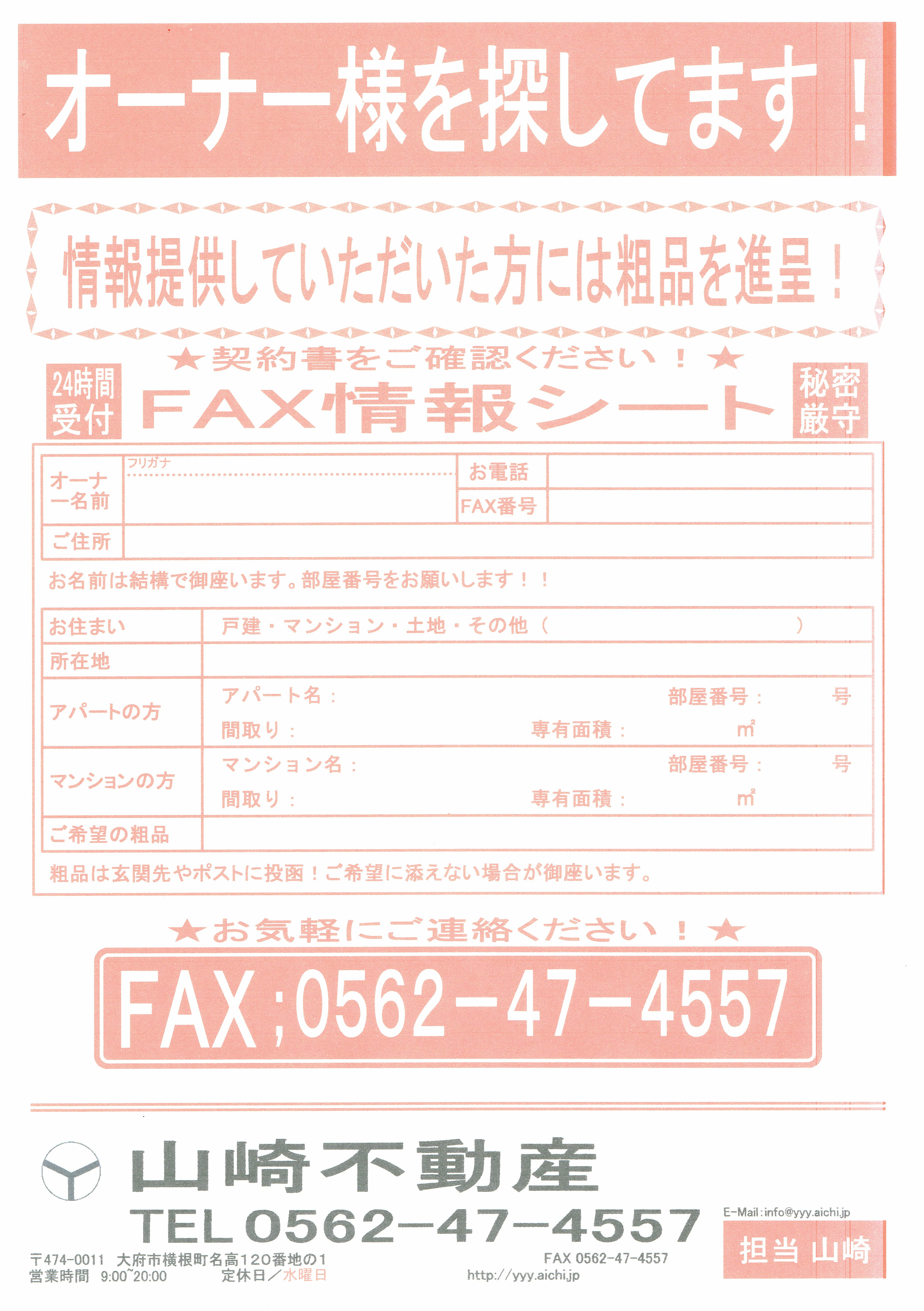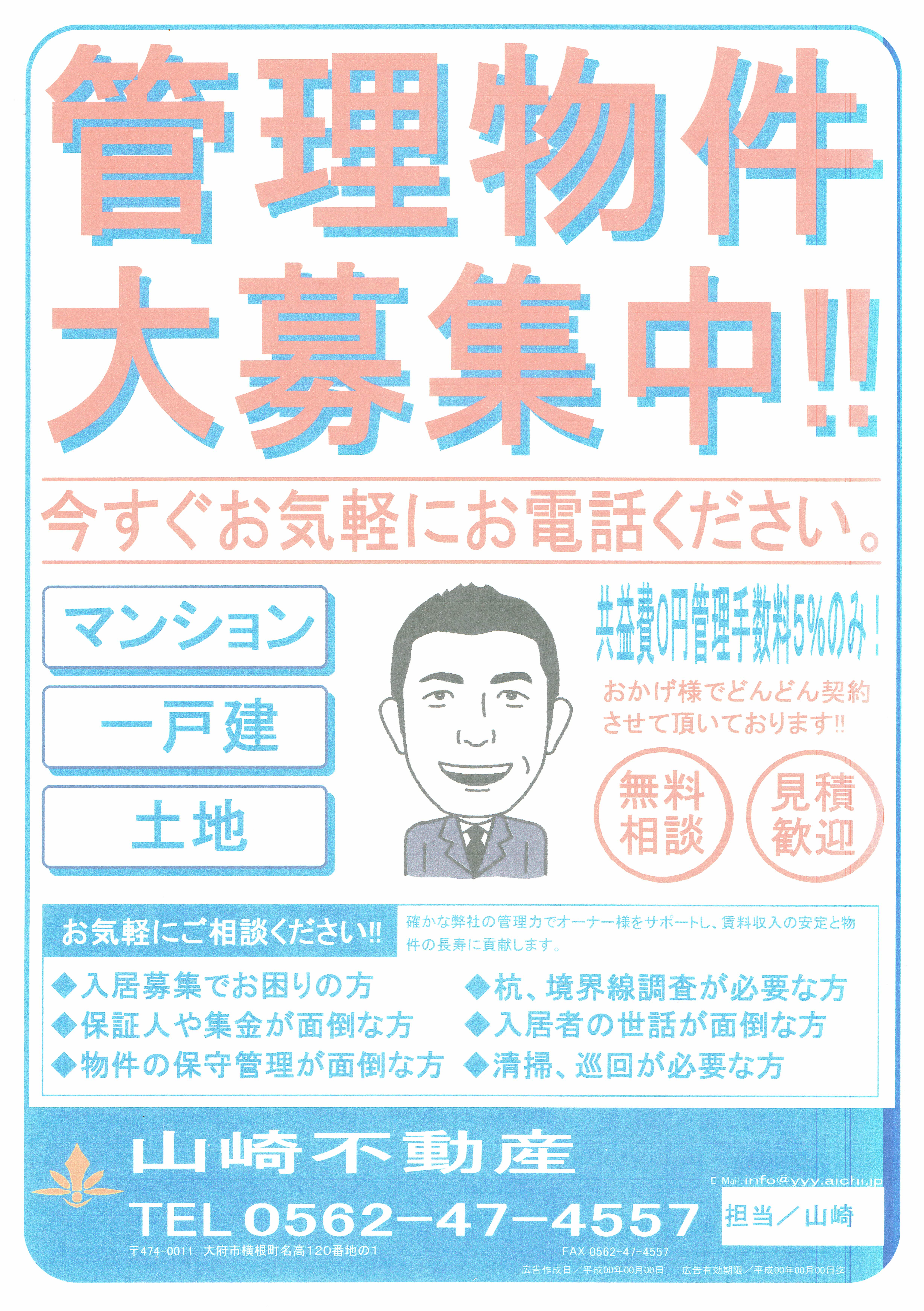 愛知県の不動産管理手数料2%のマンション管理、アパート管理や賃貸管理を業としている大府市の山崎不動産では、借主様が快適で安心に生活して頂くための面倒な日常の清掃と苦情処理と巡回、大事な物件を長持ちさせるために点検・保全あるいは修繕を提案し経費削減と利回りの向上を計ります。賃貸オーナー様がマンション経営、アパート経営、賃貸経営において空室リスクは不安の一要素。入居者の募集と保証人の斡旋と契約、煩わしいい賃料の集計・滞納の督促・集金を代行し、退去時には敷金等の精算やオーナー様に代わり立会い等もいたします。詳細は「オーナー様へ」を参照してください。