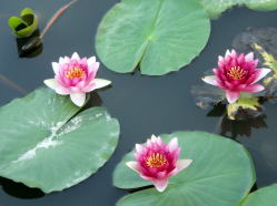 | 防護柵に守られた池に、まだ斑ではあるが美しい睡蓮が咲いている。 | ||
