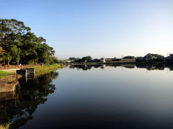 | 2003年には美しく咲いた睡蓮の花を撮影していたが、何年前頃であったか、睡蓮が全滅してしまった。色々原因調査がやられたようだが、外来種の亀にやられたとの話を聞いた。池の中に防護柵を設置し、ようやく斑ではあるが、美しく咲き出したとの情報で、2011年9月19日早朝6時ごろ散歩を兼ねて見に行く。朝日を受ける「白は池」の鏡面の水面に映る風景が見事! | ||
