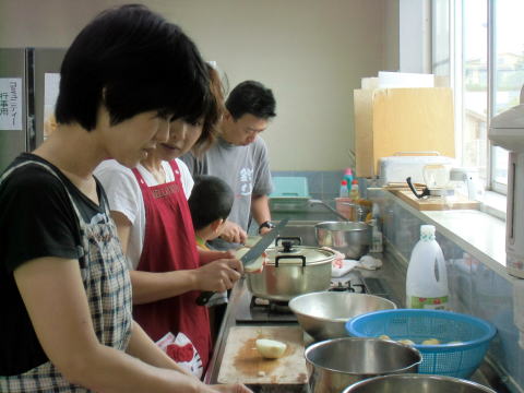 野菜の皮をむいて切るのはスカウト、炒めて煮込むのはお父さん、お母さんと担当に分かれて作業しました。