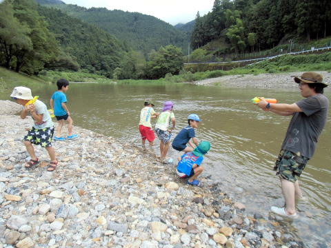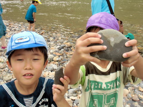 それでも少し止んだのを見はからって川で水遊びをしたり、面白い石を採ったりしました♪