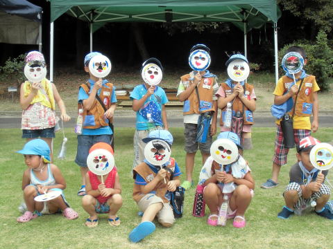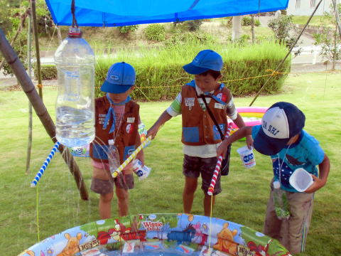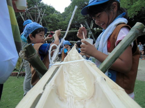 「グルメ島」(流しそうめん)・「わはは島」(お面作り)の4つの島を作り、スカウトに体験させました。