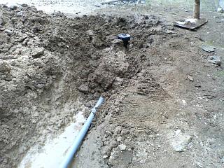 溝を掘り終えた後、配管をします。管と管のつなぎ目は、しっかりと塩ビ用ボンドでのり付けします。