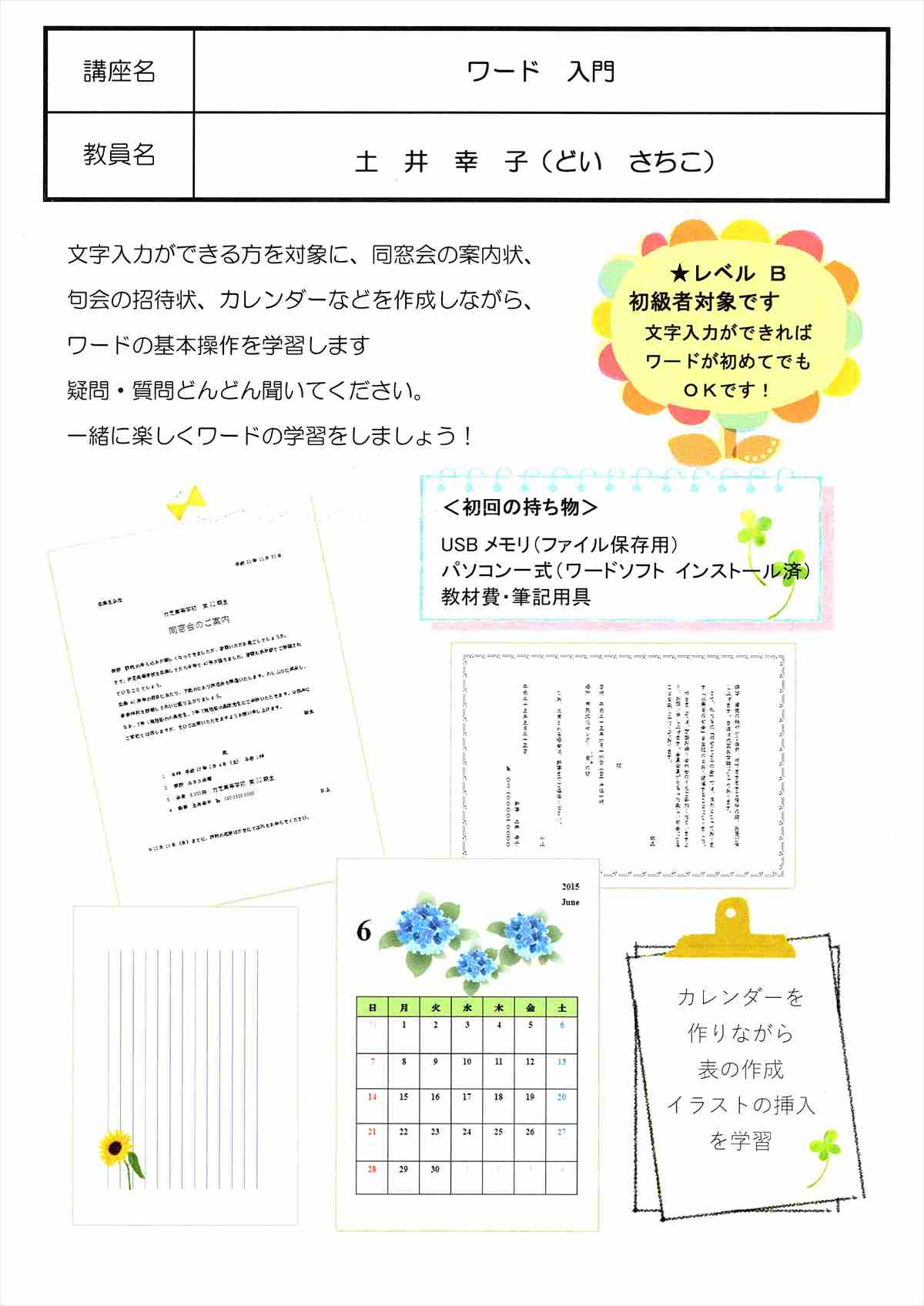 | ★1 | ワード 入門 | 土井幸子 | 4/1・4/8・4/15・4/22・4/29・5/6・5/13・5/20・5/27・6/3 | 水 | 13:30~15:00 | 勤セ | 10 | B | ¥2,500 | 18 |