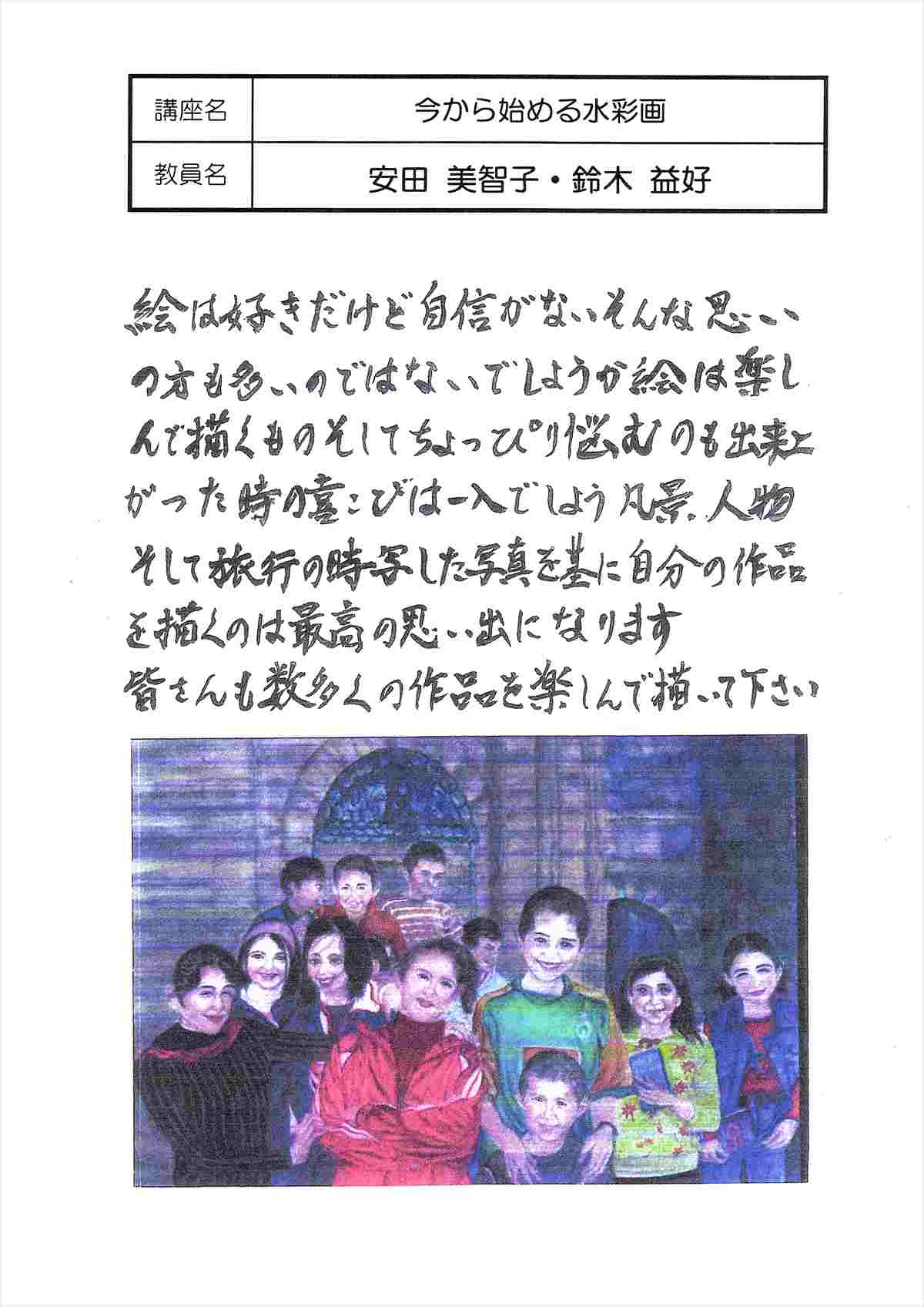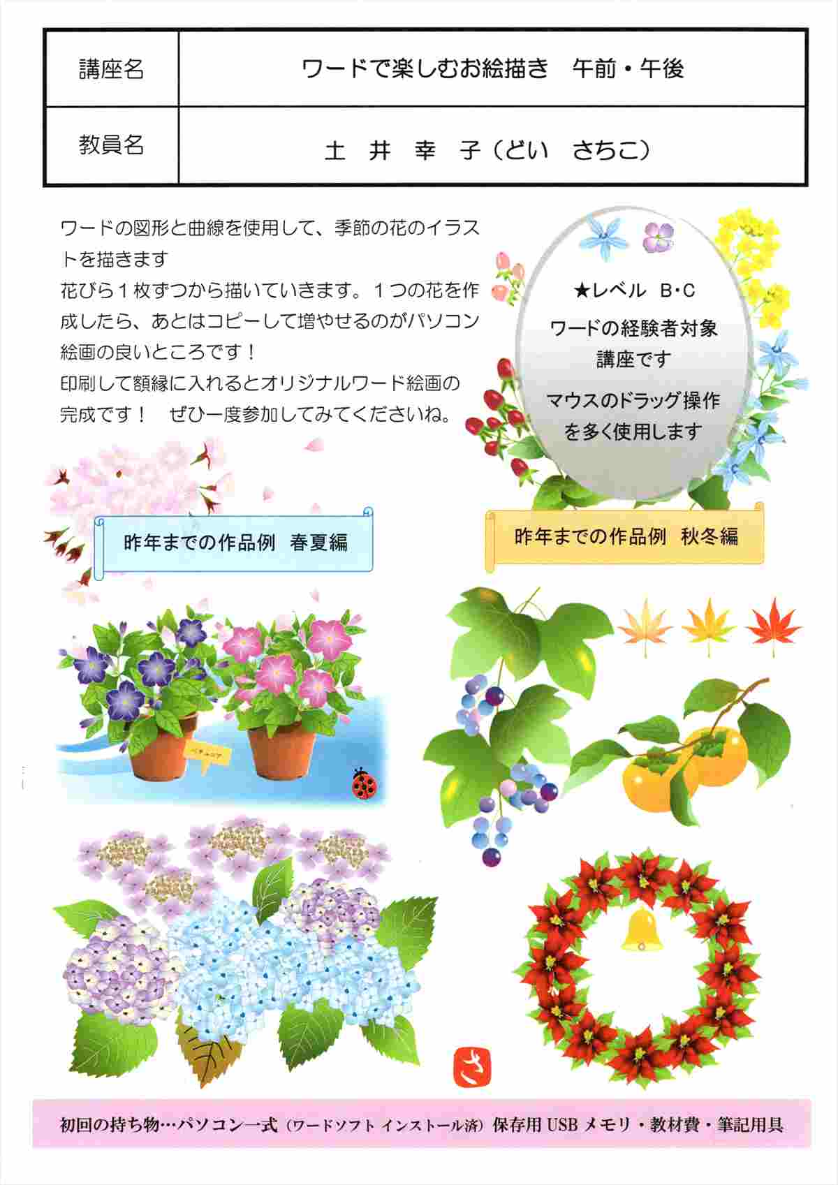 | 3 | ワードで楽しむお絵描き講座(午後) | 土井幸子 | 6/12・6/19・6/26・7/3・7/1・7/17・7/24・7/31・8/7・8/14 | 金 | 13:30~15:00 | 勤セ・創杜 | 10 | BC | ¥2,000 | 18 |