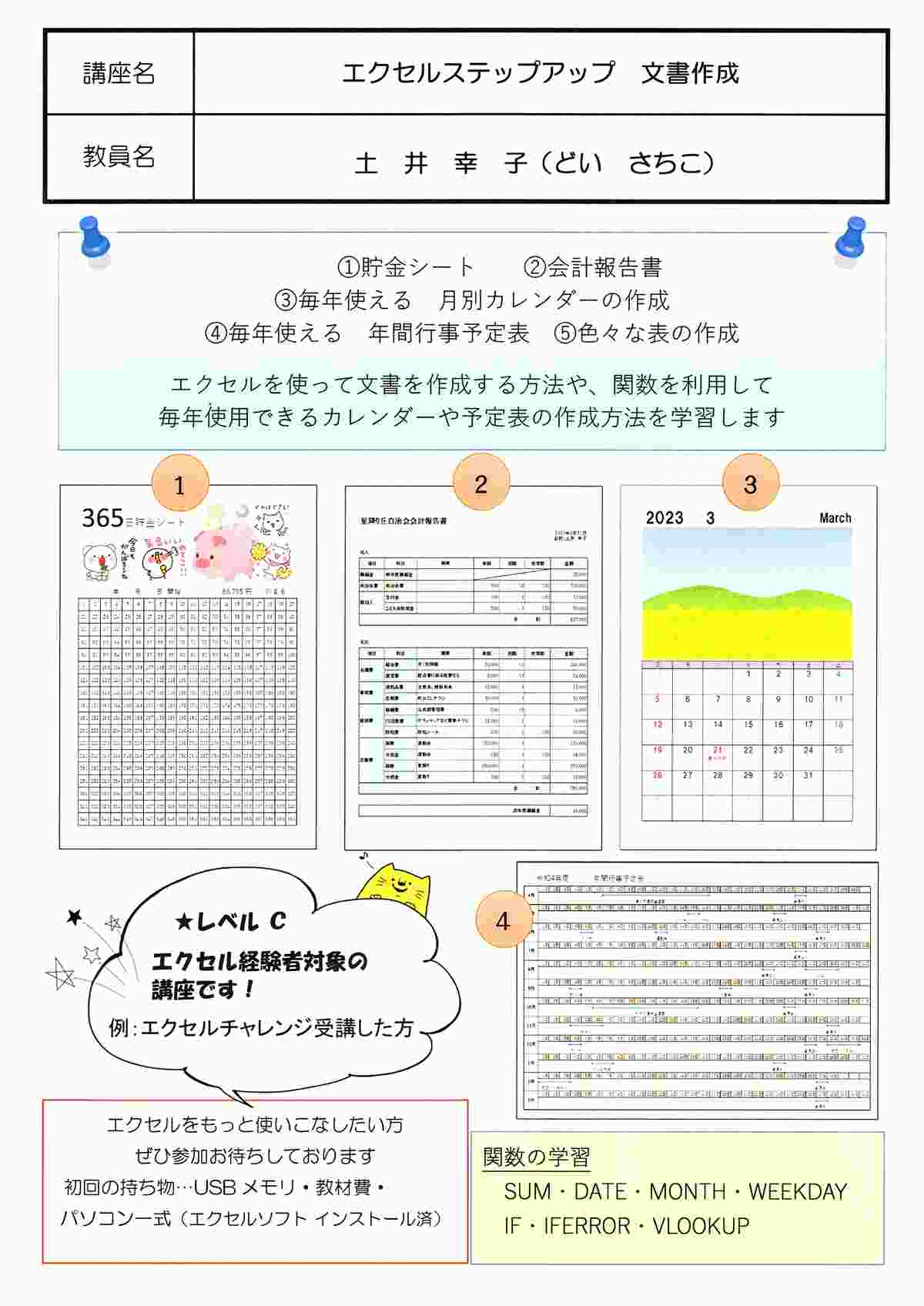 | 6 | エクセル チャレンジ | 土井幸子 | 6/10・6/17・6/24・7/1・7/8・7/15・7/22・7/29・8/5・8/12 | 水 | 10:30~12:00 | 勤セ・創杜 | 10 | BC | ¥3,200 | 18 |