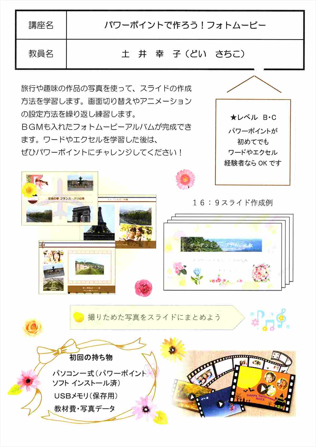 | 8 | パワーポイントで作ろう!フォトムービー | 土井幸子 | 4/3・4/10・4/17・4/24・5/1・5/8・5/15・5/22・5/29・6/5 | 金 | 10:30~12:00 | 勤セ | 10 | BC | ¥4,500 | 18 |