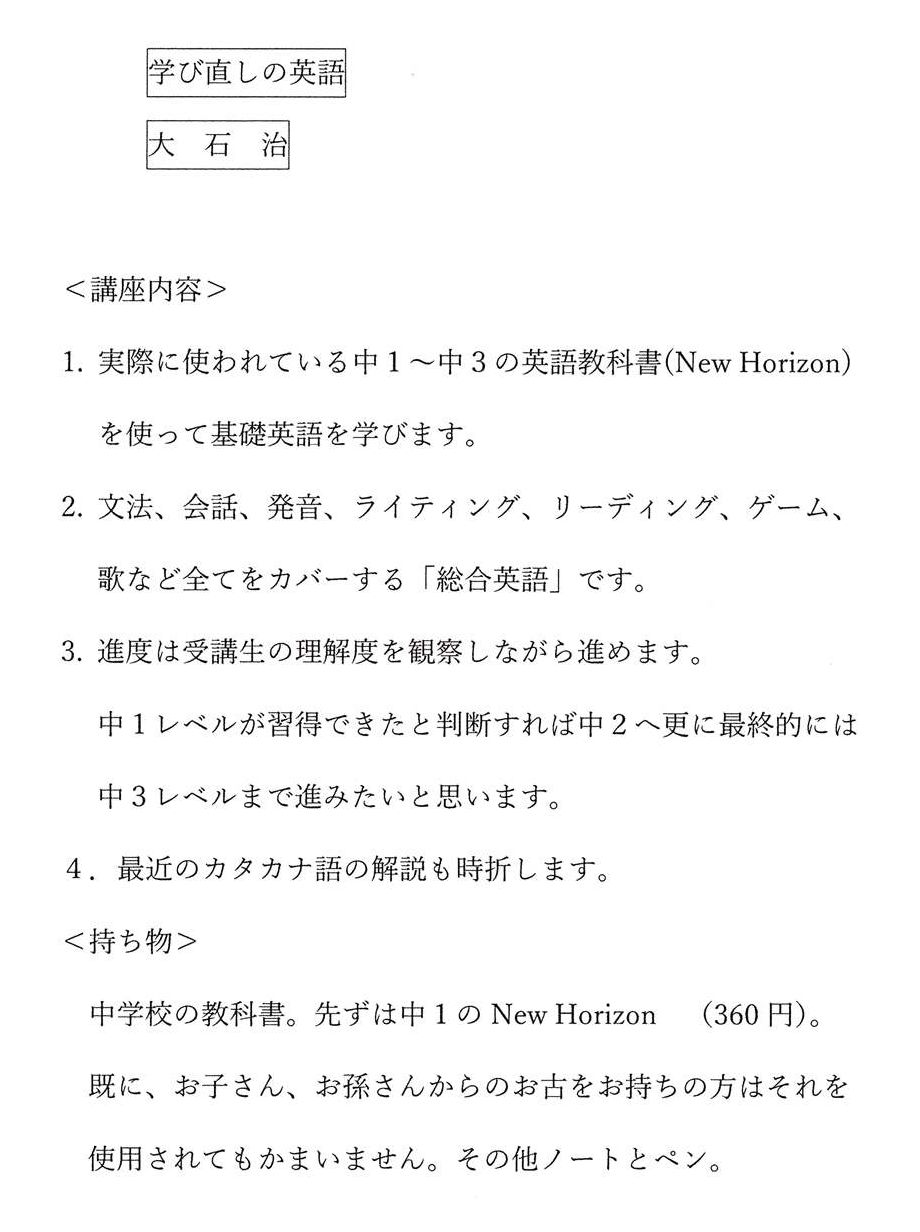 | ★10 | 学び直しの英語(中学教科書利用) | 大石 治 | 4/9・4/16・4/23・4/30・5/14・5/21・5/28・6/4・6/11・6/18 | 木 | 13:30~15:00 | 上公 | 10 | AB | ¥360 | 20 |