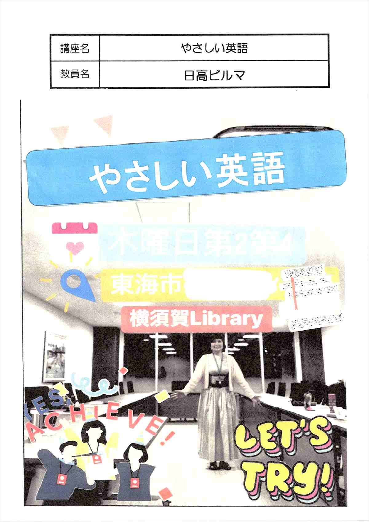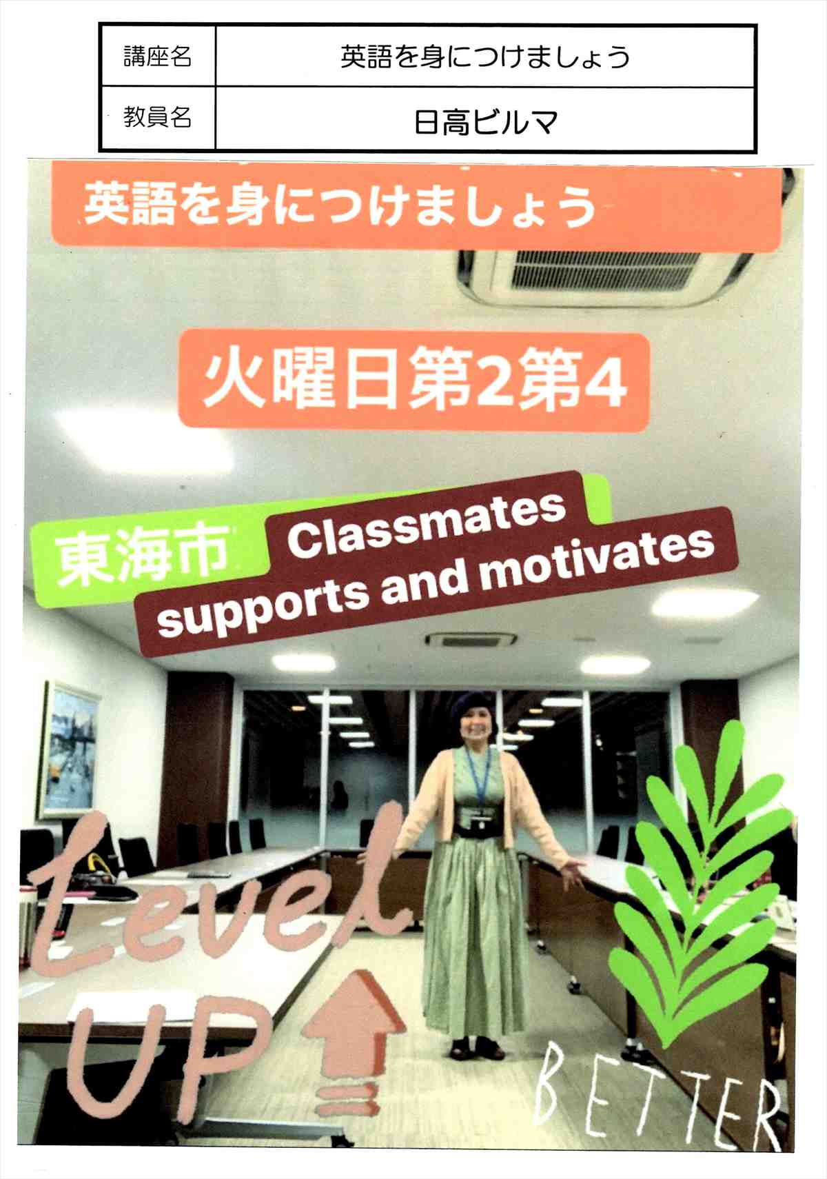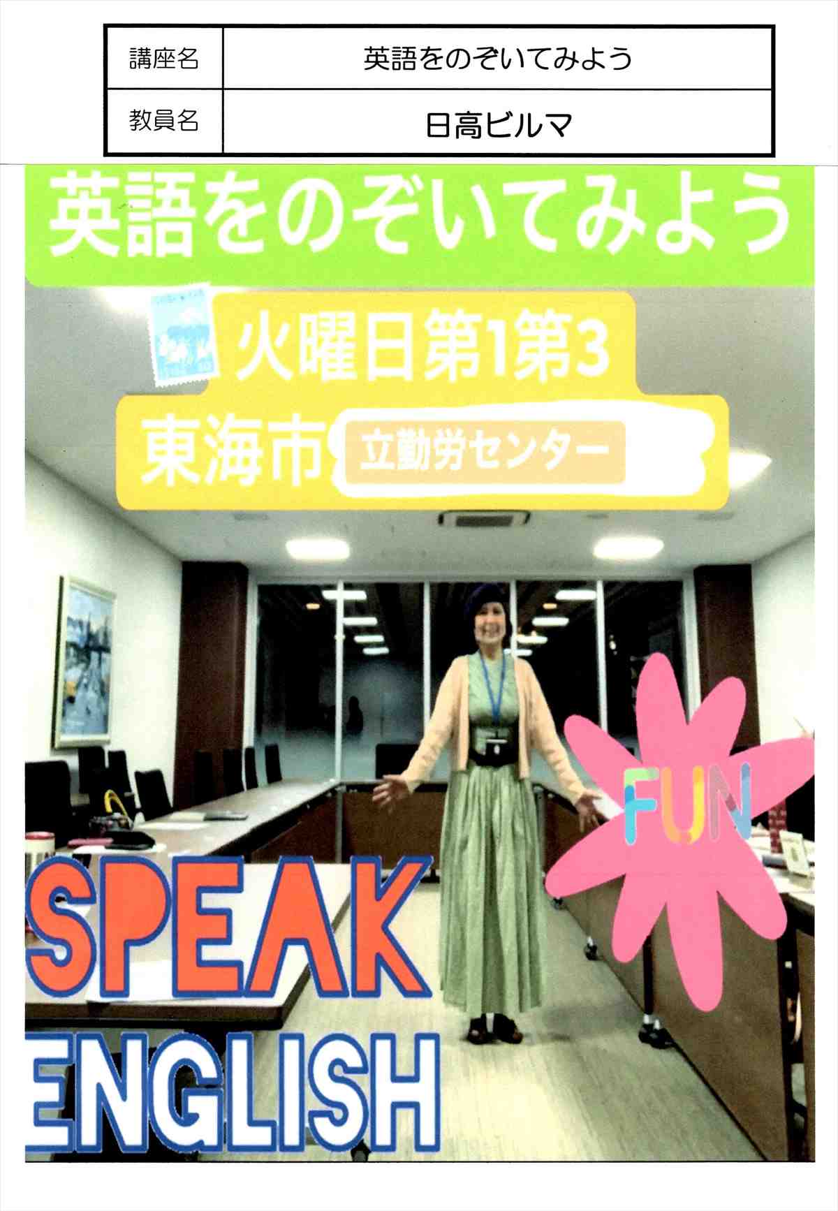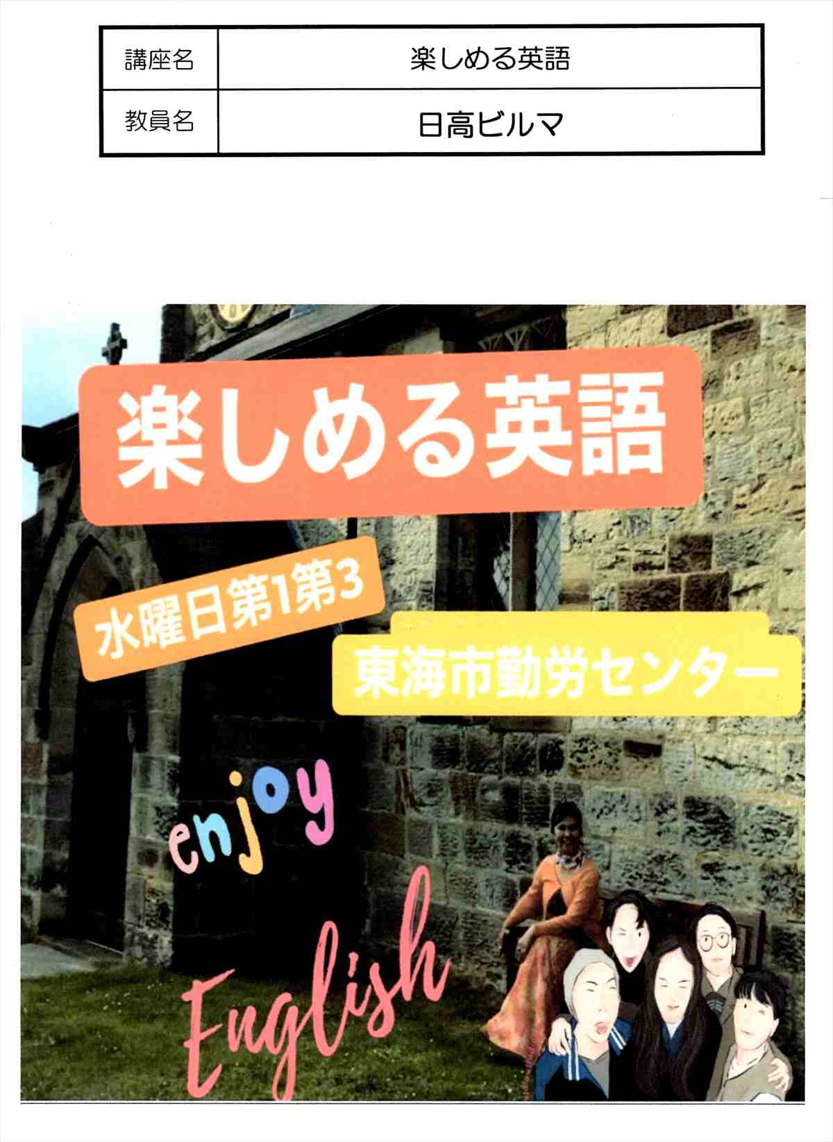 | 14 | 楽しめる英語 | 日高ビルマ | 4/15・5/20・6/3・6/17・7/1・7/15・7/29・8/5・8/19・9/2 | 水 | 10:00~11:30 | 勤セ・創杜 | 10 | C | ¥3,000 | 20 |