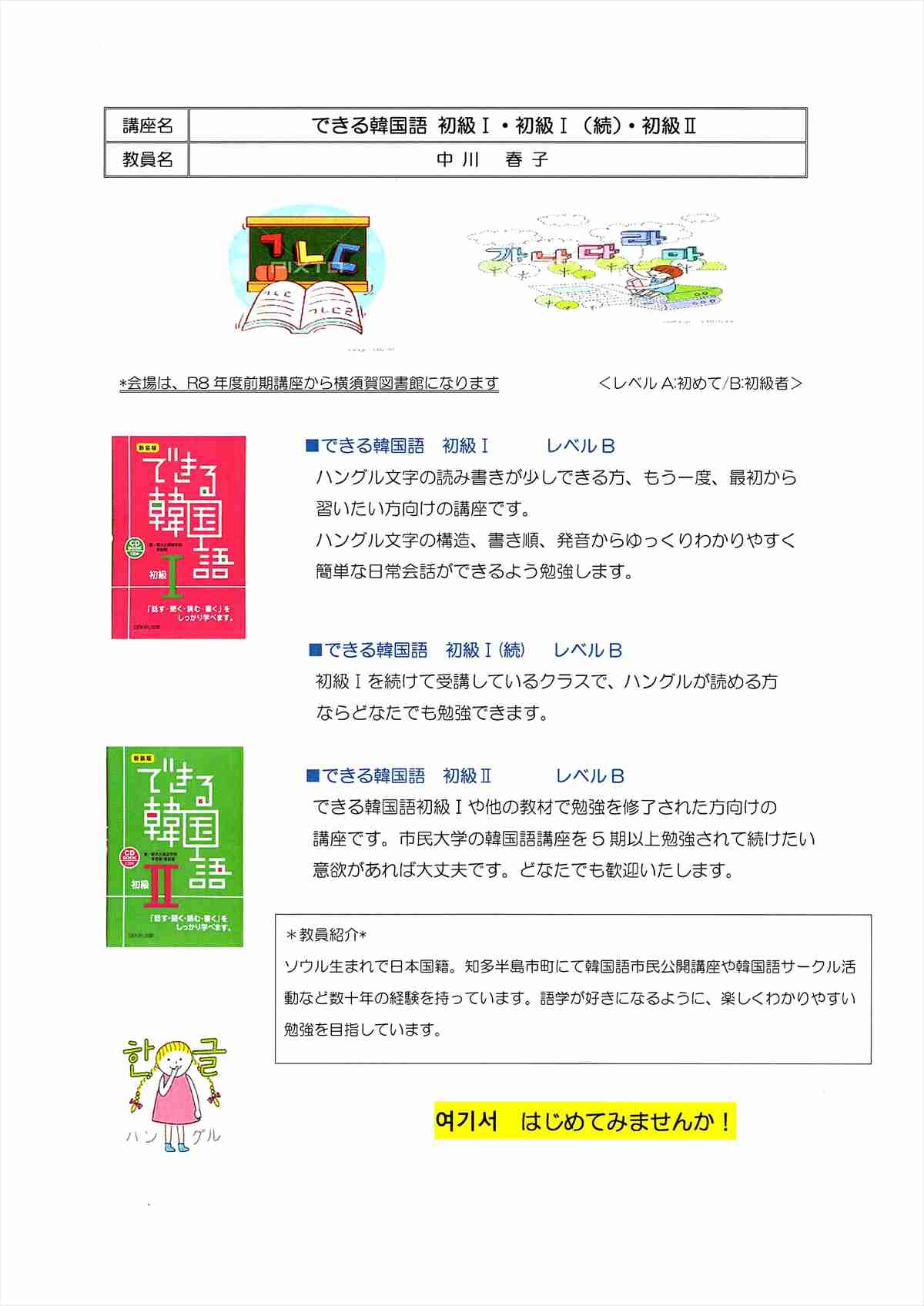 | 26 | できる韓国語 初級Ⅰ(続) | 中川春子 | 4/18・5/2・5/16・6/6・6/20・7/4・7/18・8/1・8/29・9/5 | 土 | 11:00~12:30 | 横図 | 10 | B | ¥2,200 | 16 |