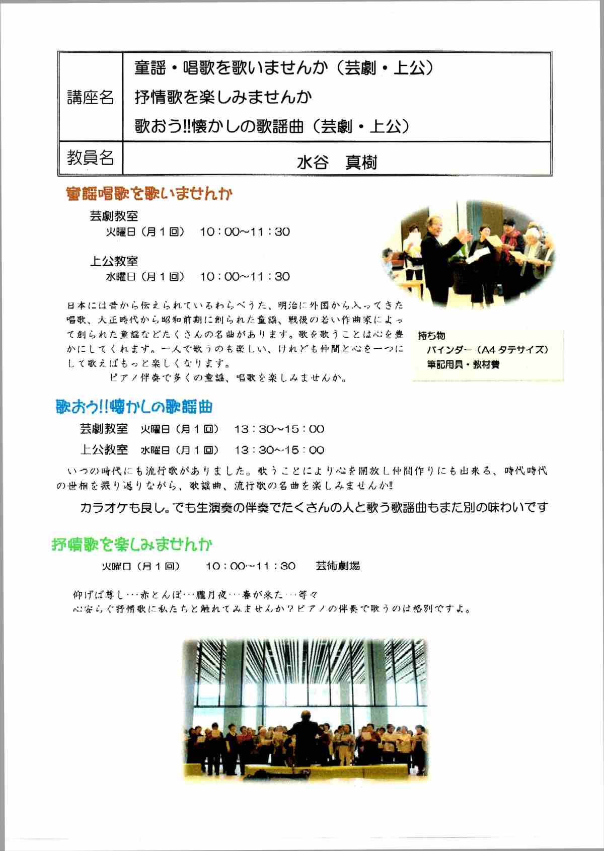 | 30 | 抒情歌を楽しみませんか | 水谷真樹 | 4/14・5/19・6/9・7/14・9/8 | 火 | 10:00~11:30 | 芸劇 | 5 | ABC | ¥700 | 40 |