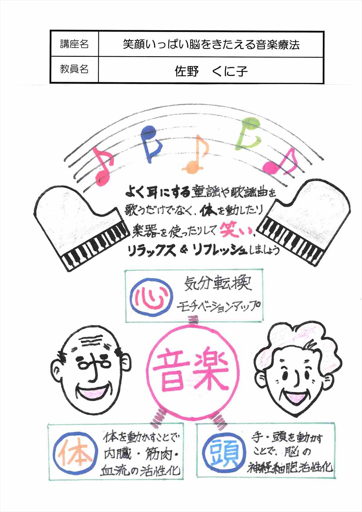 | 34 | 笑顔いっぱい脳をきたえる音楽療法 | 佐野くに子 | 4/22・5/27・6/24・7/22・8/26 | 水 | 15:00~16:30 | 大市 | 5 | ABC | ¥0 | 20 |