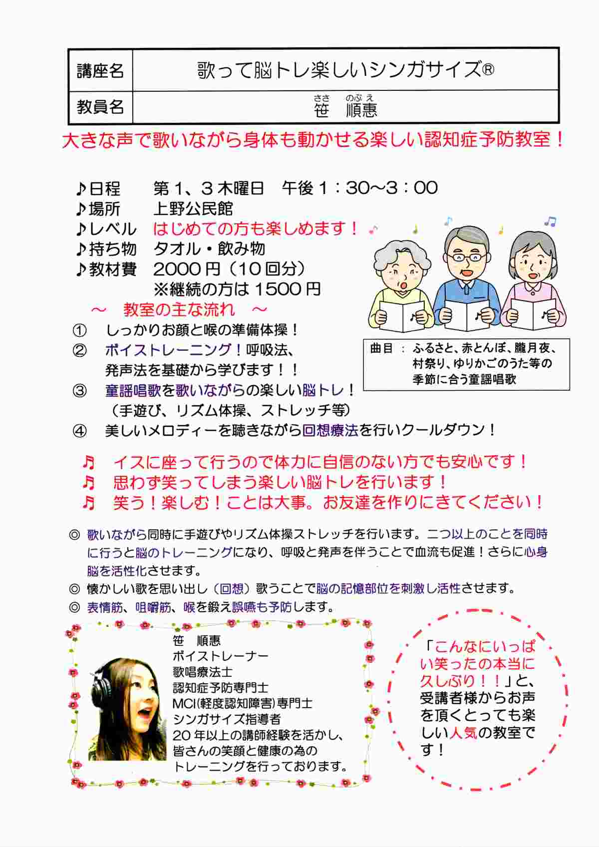 | 35 | 歌って脳トレ楽しいシンガサイズ® | 笹 順惠 | 4/16・5/21・6/4・6/18・7/2・7/16・8/6・8/20・9/3・9/17 | 木 | 13:30~15:00 | 上公 | 10 | ABC | ¥2,000 | 20 |
