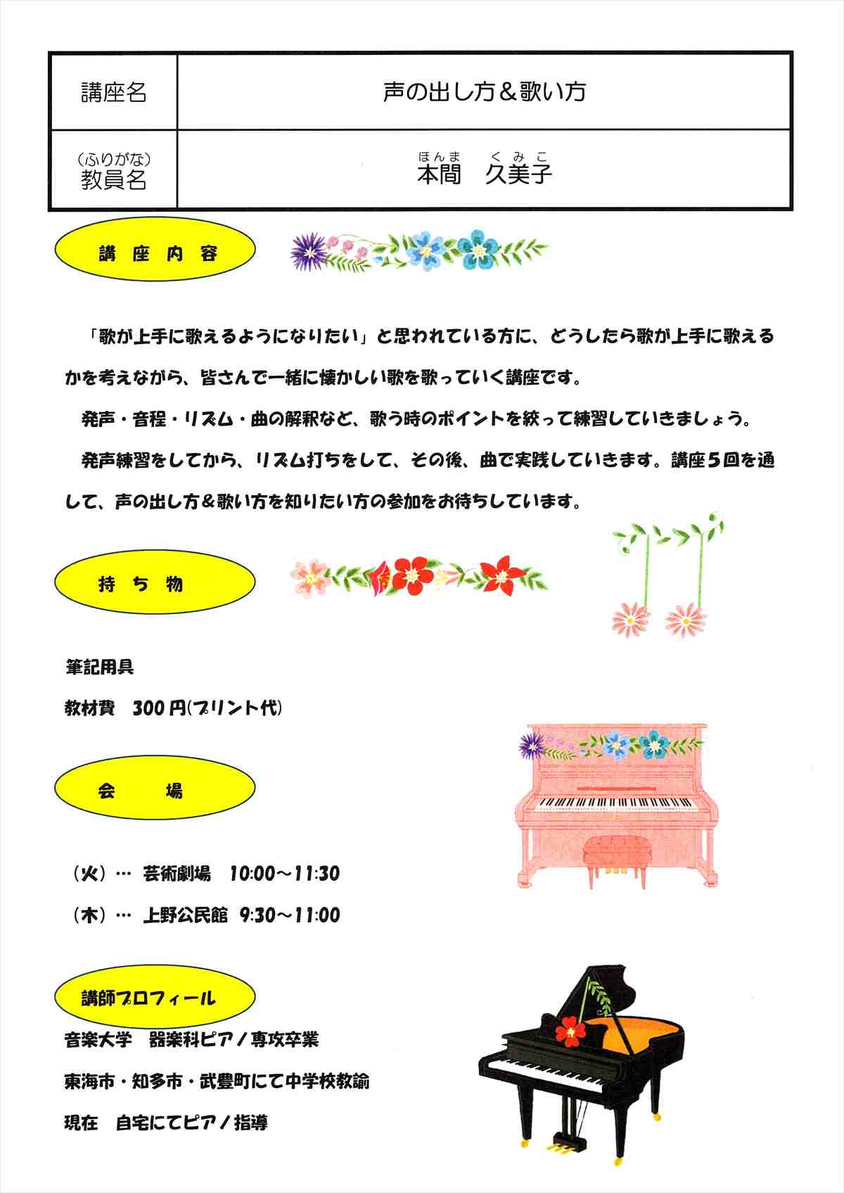 | 37 | 声の出し方&歌い方(木曜) | 本間久美子 | 4/9・5/14・6/11・7/9・9/10 | 木 | 9:30~11:00 | 上公 | 5 | ABC | ¥300 | 20 |