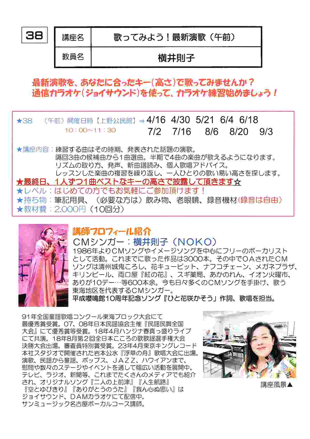 | 38 | 歌ってみよう!最新演歌(午前) | 横井則子 | 4/16・4/30・5/21・6/4・6/18・7/2・7/16・8/6・8/20・9/3 | 木 | 10:00~11:30 | 上公 | 10 | AB | ¥2,000 | 25 |