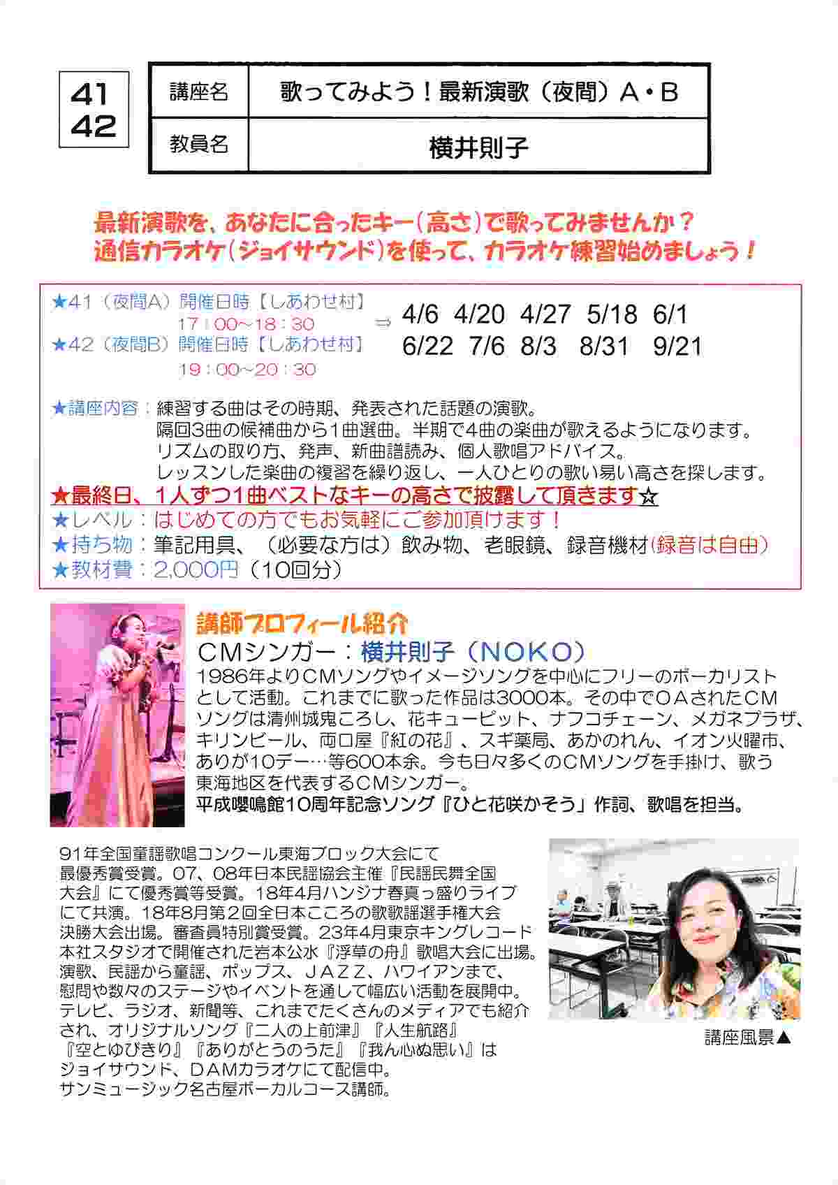 | 42 | 歌ってみよう!最新演歌(夜間)B | 横井則子 | 4/6・4/20・4/27・5/18・6/1・6/22・7/6・8/3・8/31・9/21 | 月 | 19:00~20:30 | し村 | 10 | AB | ¥2,000 | 25 |