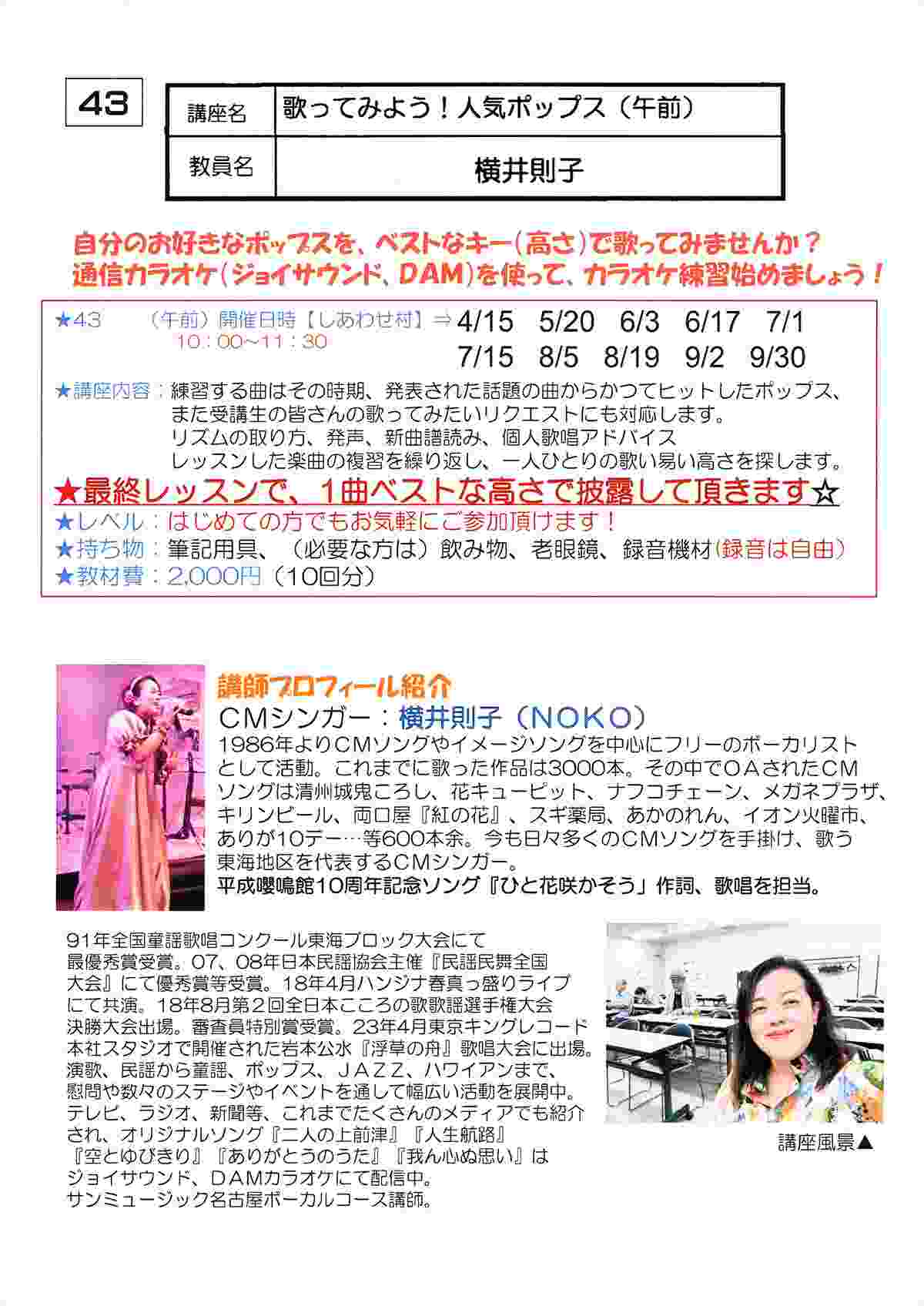 | 43 | 歌ってみよう!人気ポップス(午前) | 横井則子 | 4/15・5/20・6/3・6/17・7/1・7/15・8/5・8/19・9/2・9/30 | 水 | 10:00~11:30 | し村 | 10 | AB | ¥2,000 | 25 |