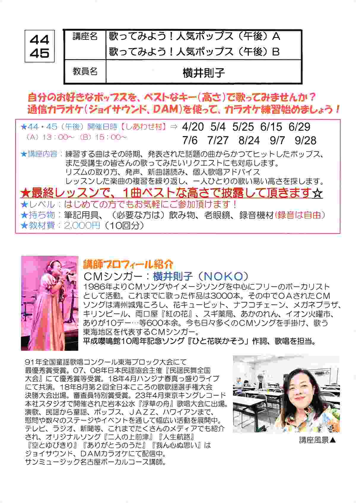 | 44 | 歌ってみよう!人気ポップス(午後)A | 横井則子 | 4/20・5/4・5/25・6/15・6/29・7/6・7/27・8/24・9/7・9/28 | 月 | 13:00~14:30 | し村 | 10 | AB | ¥2,000 | 25 |