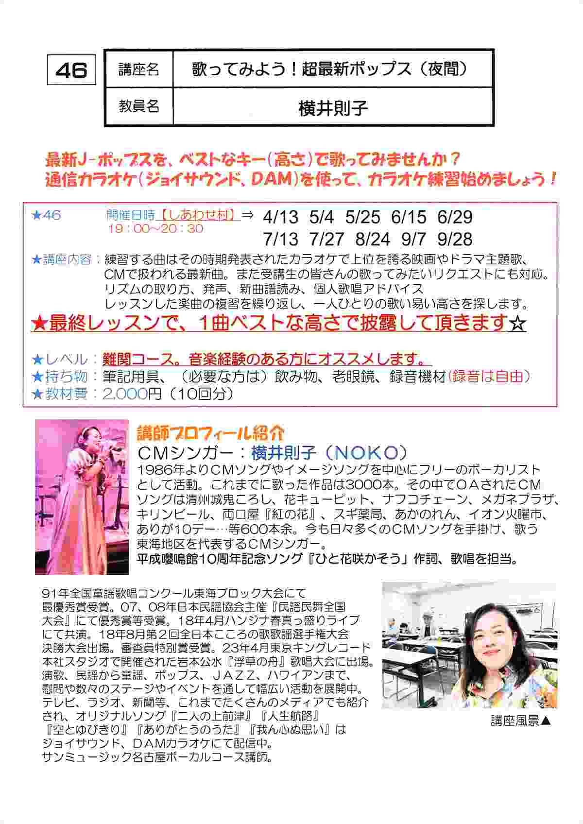 | 46 | 歌ってみよう!超最新ポップス(夜間) | 横井則子 | 4/13・5/4・5/25・6/15・6/29・7/13・7/27・8/24・9/7・9/28 | 月 | 19:00~20:30 | し村 | 10 | C | ¥2,000 | 25 |