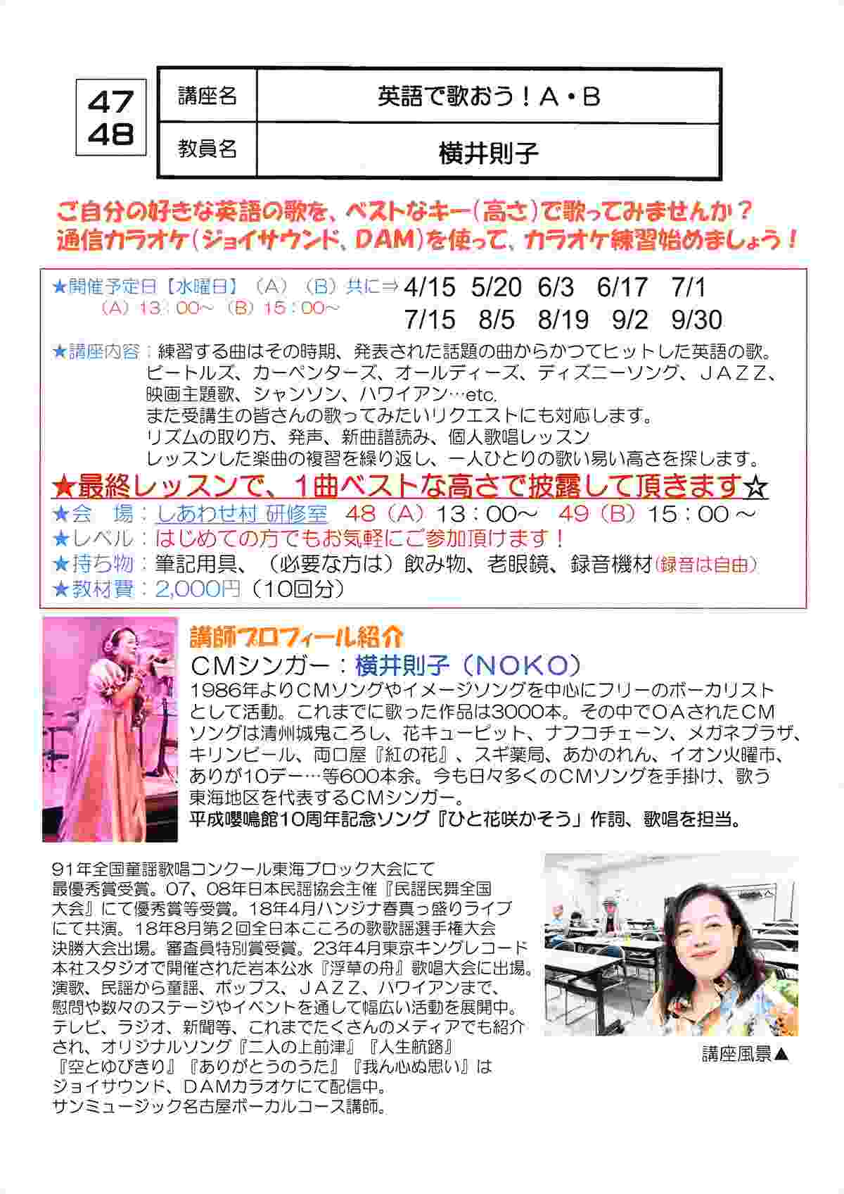 | 48 | 英語で歌おう!B | 横井則子 | 4/15・5/20・6/3・6/17・7/1・7/15・8/5・8/19・9/2・9/30 | 水 | 15:00~16:30 | し村 | 10 | AB | ¥2,000 | 25 |