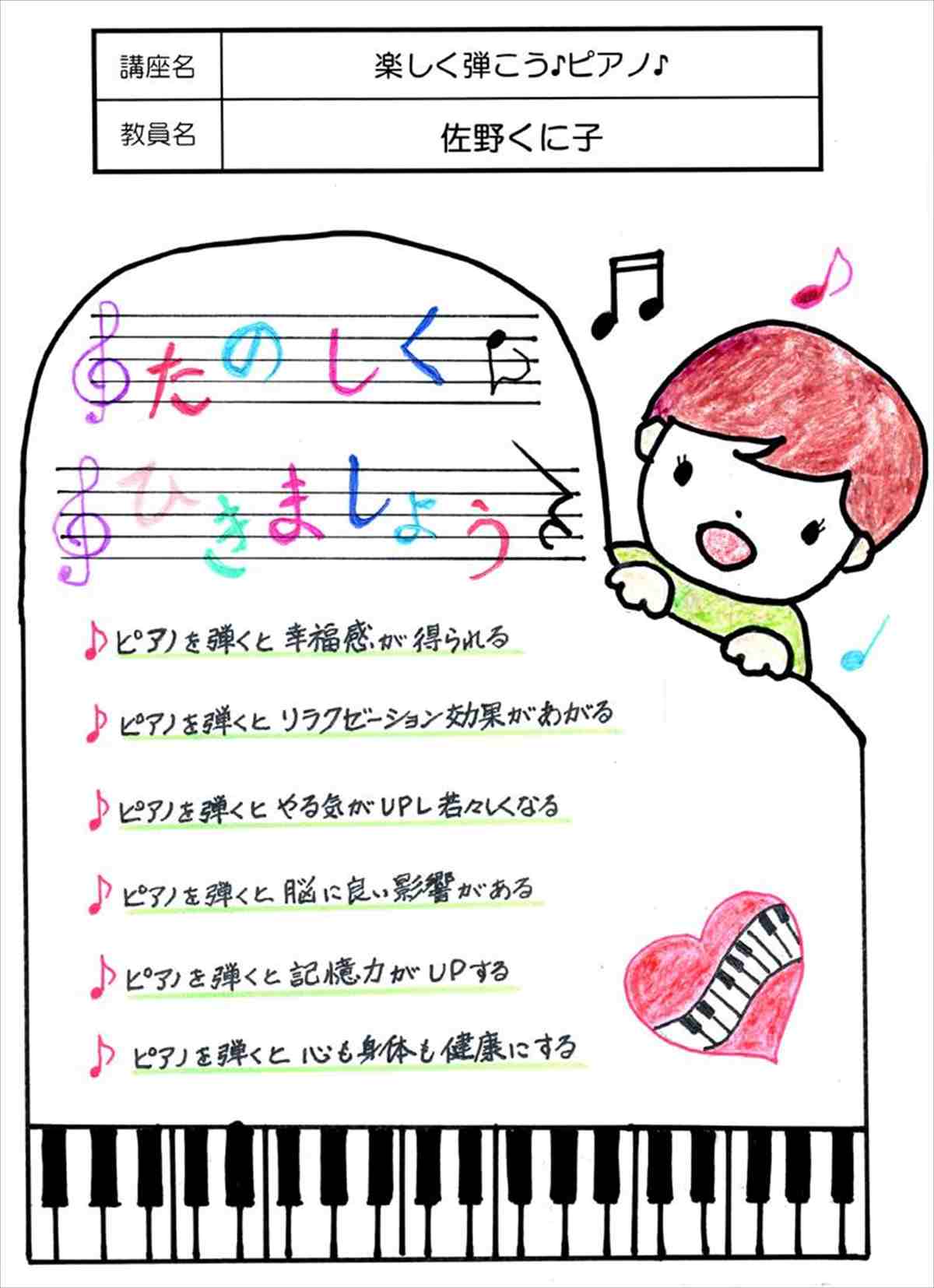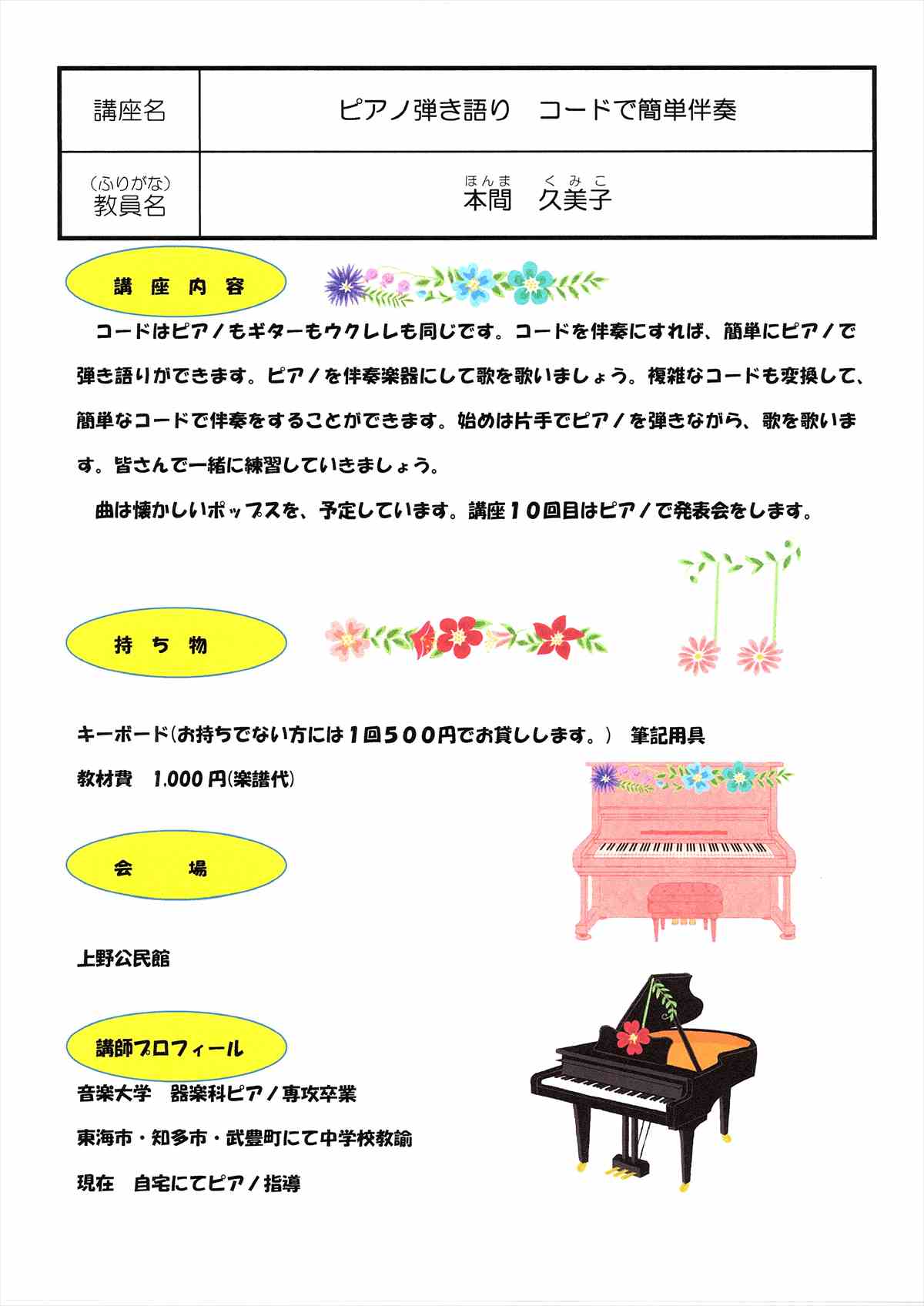 | 50 | ピアノ弾き語り コードで簡単伴奏 | 本間久美子 | 4/7・4/21・5/19・6/2・6/16・7/7・8/4・8/18・9/1・9/15 | 火 | 13:15~14:45 | 上公 | 10 | ABC | ¥1,000 | 15 |