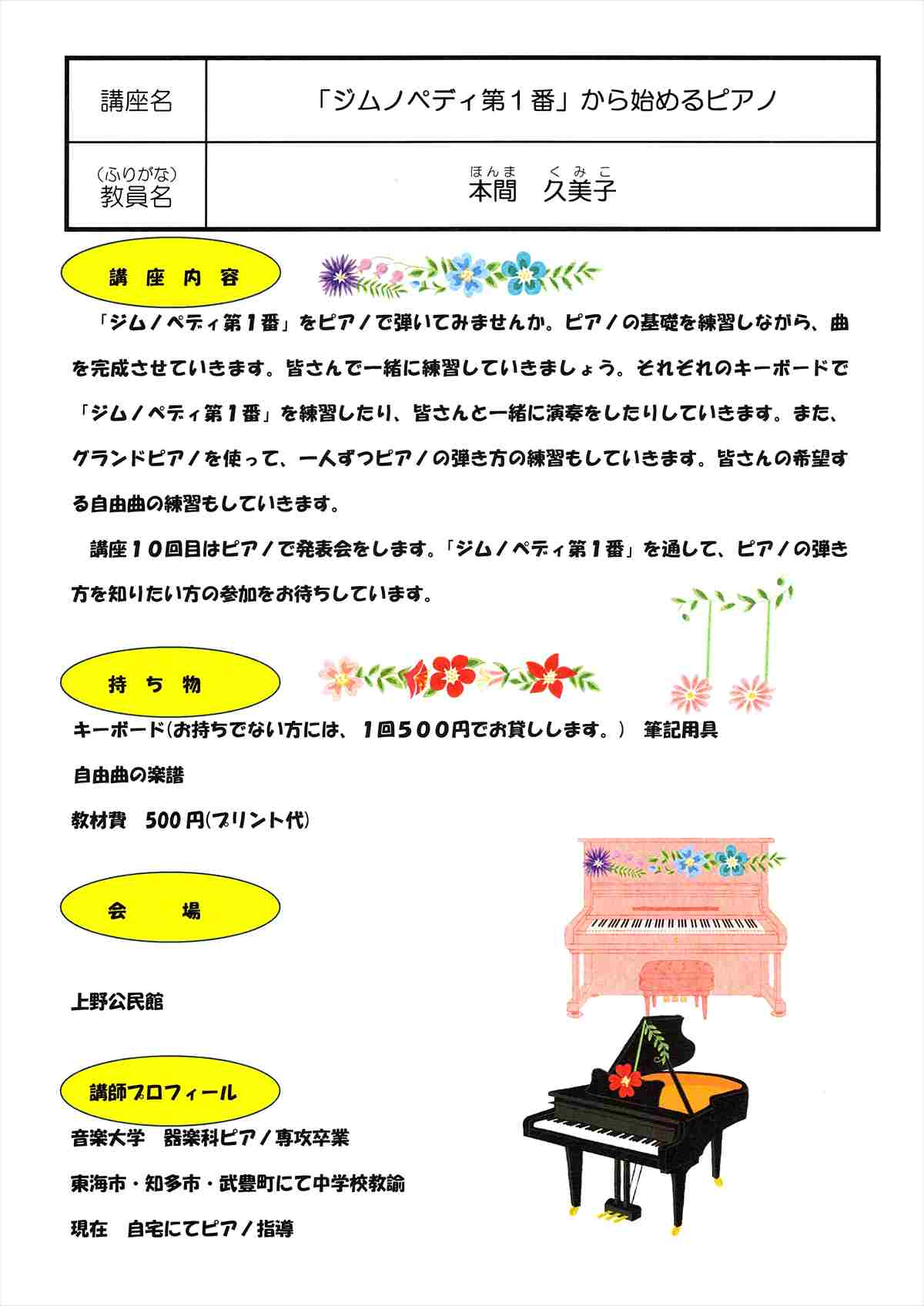 | 51 | 「ジムノペディ第1番」から始めるピアノ | 本間久美子 | 4/7・4/21・5/19・6/2・6/16・7/7・8/4・8/18・9/1・9/15 | 火 | 15:00~16:30 | 上公 | 10 | BC | ¥500 | 15 |