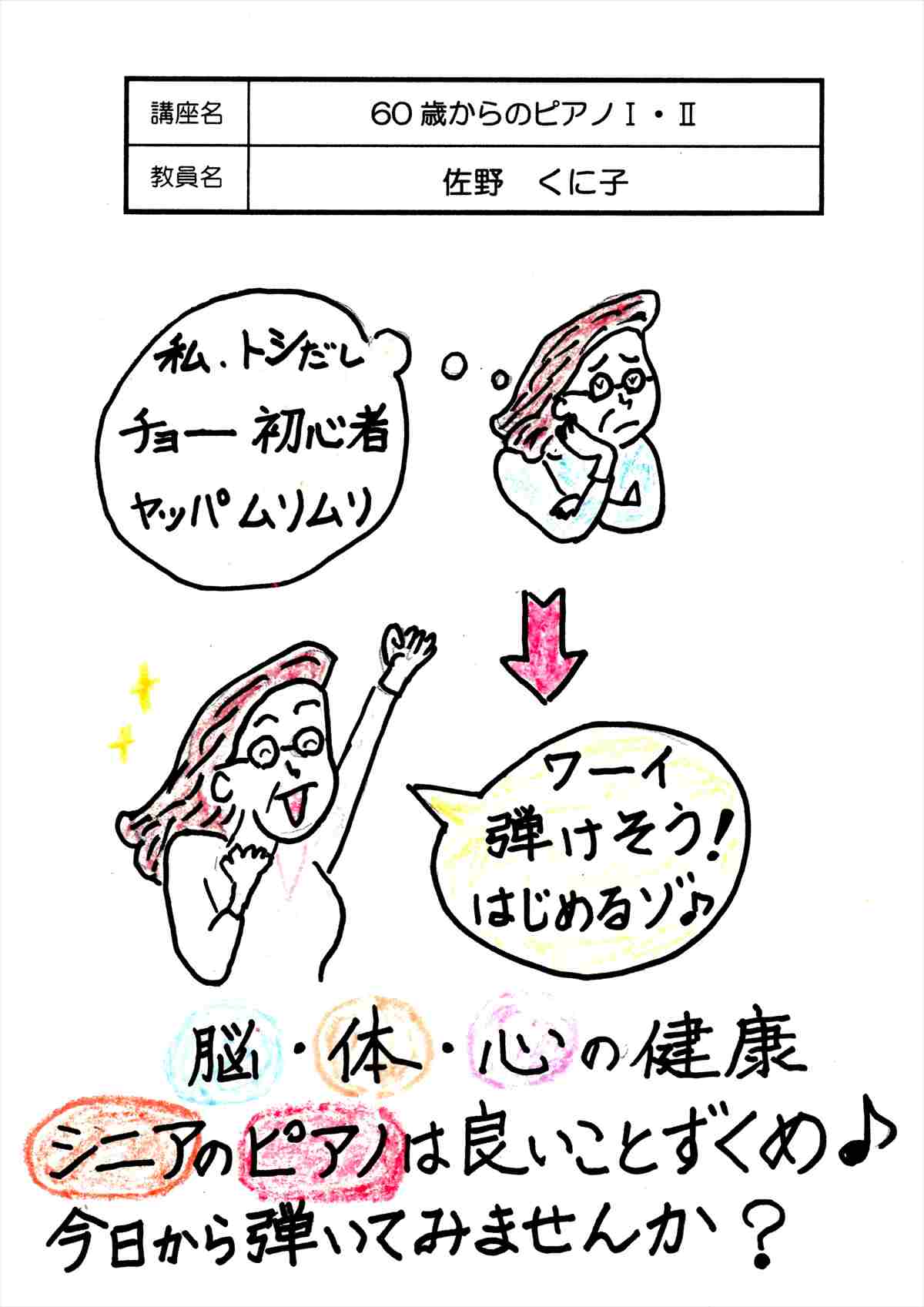 | 52 | 60歳からのピアノⅠ | 佐野くに子 | 4/21・5/19・6/16・6/30・7/7・7/21・8/4・8/18・9/1・9/15 | 火 | 13:20~14:50 | 加市 | 10 | A | ¥1,320 | 20 |