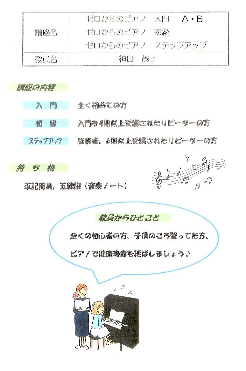| 55 | ゼロからのピアノ 入門A | 神田茂子 | 5/1(金)・5/14・6/11・6/25・7/9・7/23・ 8/7(金)・8/20・9/4(金)・9/10 |