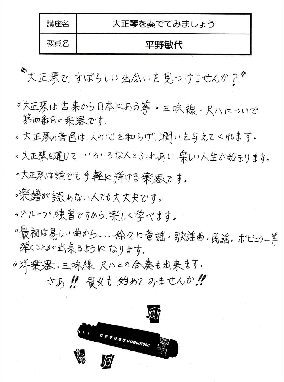 | 59 | 大正琴を奏でてみましょう | 平野敏代 | 4/15・5/20・6/3・6/17・7/1・7/15・8/19・9/2・9/16・9/30 | 水 | 10:00~11:30 | 芸劇 | 10 | AB | ¥1,000 | 13 |