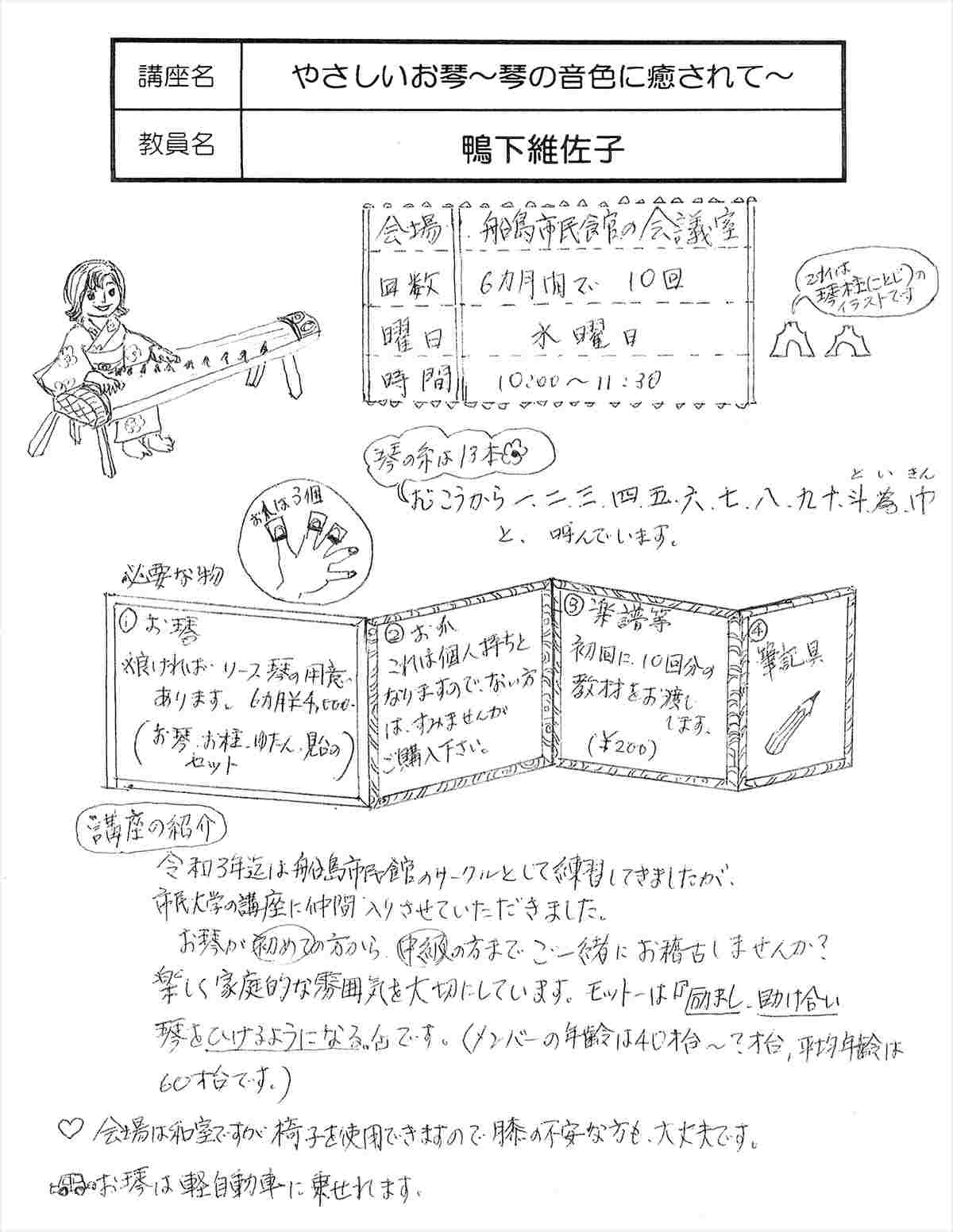 | 60 | やさしいお琴~琴の音色に癒されて~ | 鴨下維佐子 | 4/8・4/22・5/13・5/27・6/10・6/24・7/8・7/22・8/26・9/9 | 水 | 10:00~11:30 | 船市 | 10 | ABC | ¥200 | 10 |