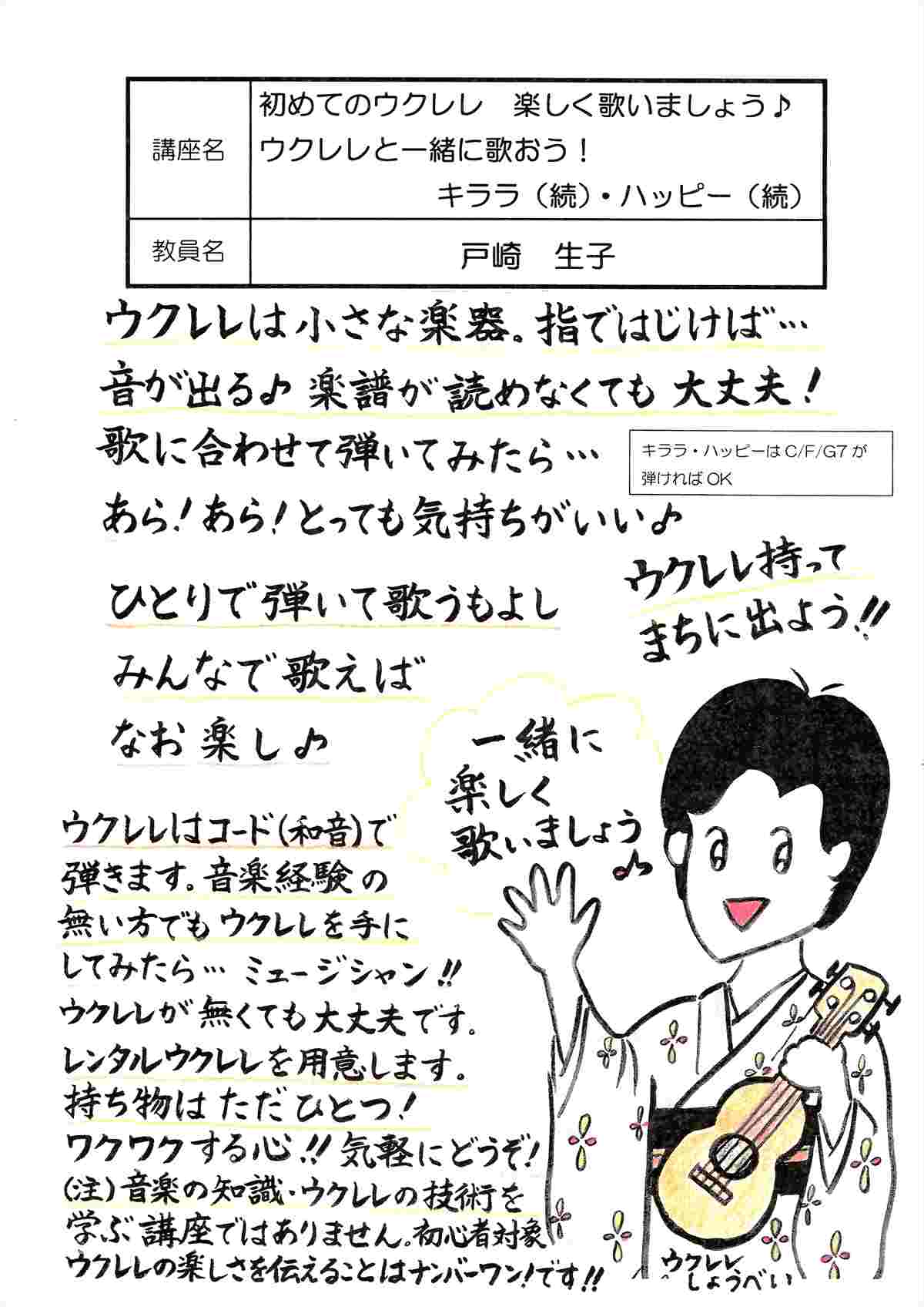 | 62 | ウクレレと一緒に歌おう♪キララ(続) | 戸崎生子 | 7/23・8/6・8/13・9/10・9/17 | 木 | 9:15~10:45 | 芸劇 | 5 | B | ¥300 | 20 |