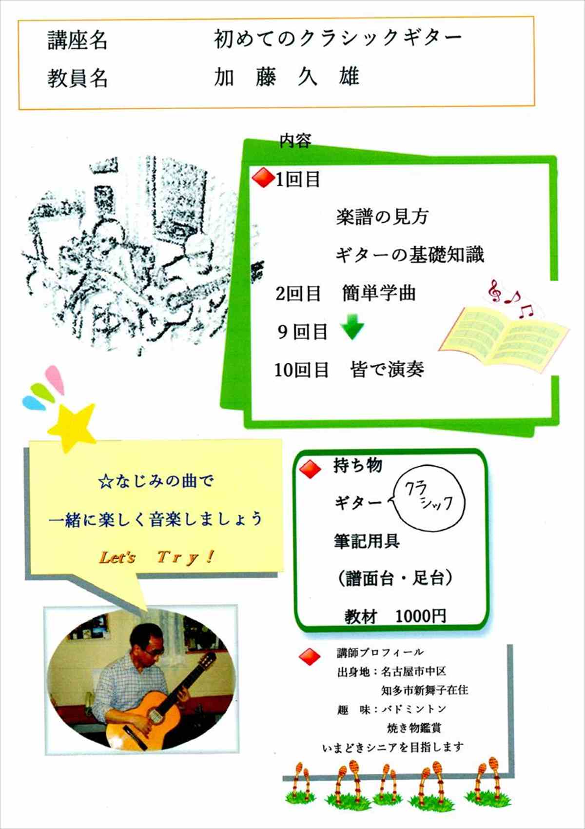 | 64 | 初めてのクラシックギター | 加藤久雄 | 4/10・4/24・5/8・5/22・6/12・6/26・7/10・7/24・9/11・9/25 | 金 | 10:00~11:30 | 芸劇 | 10 | ABC | ¥1,000 | 15 |