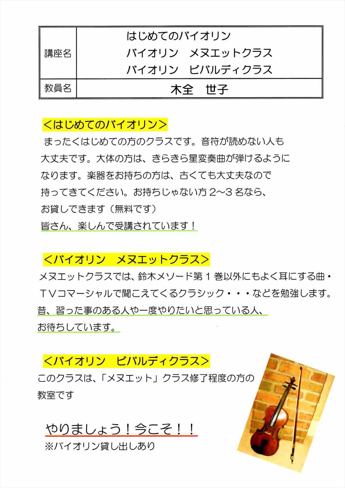 | 68 | バイオリン ビバルディクラス | 木全世子 | 4/7・4/21・5/19・6/2・6/16・7/7・8/4・8/18・9/1・9/15 | 火 | 10:30~12:00 | 上公 | 10 | C | ¥1,000 | 10 |