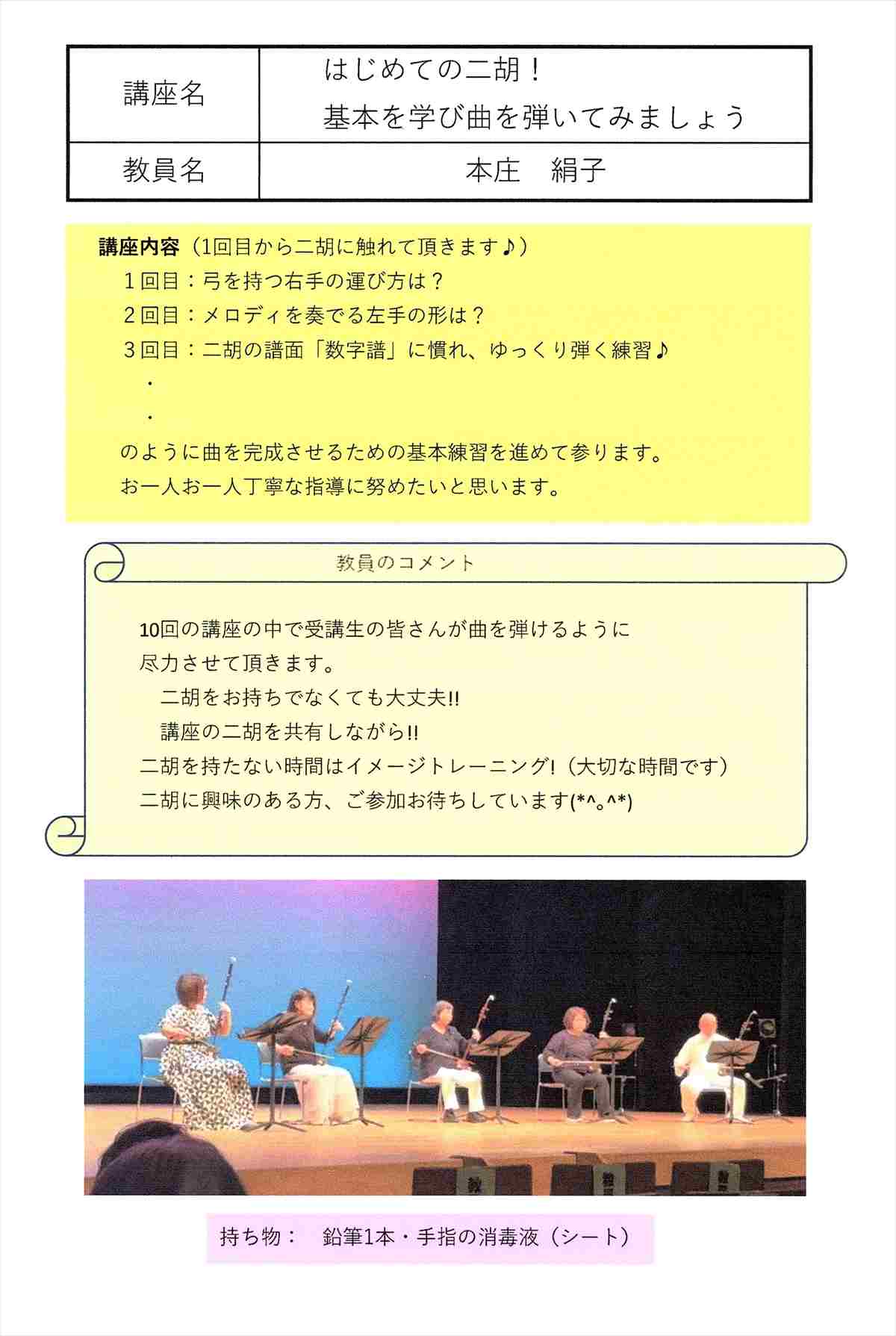 | 70 | 二胡で奏でよう日本のうた | 本庄絹子 | 4/9・4/23・5/14・5/28・6/11・6/25・7/9・7/23・8/27・9/10 | 木 | 10:00~11:30 | 上公 | 10 | B | ¥600 | 12 |