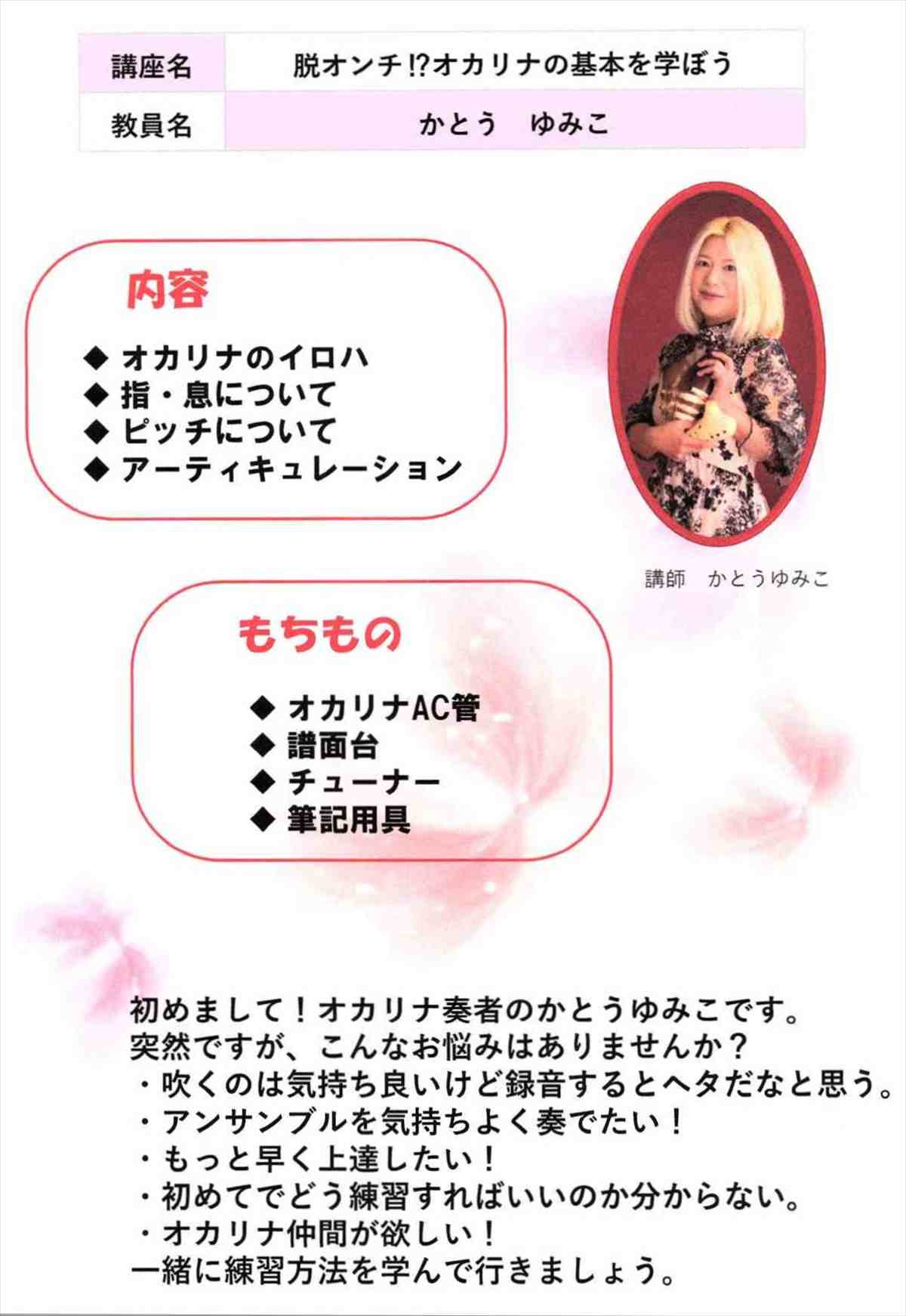| 71 | 脱オンチ!?オカリナの基本を学ぼう | かとうゆみこ | 4/11・5/9・6/13・7/11・8/8 | 土 | 14:00~15:30 | し村 | 5 | AB | ¥800 | 20 |
