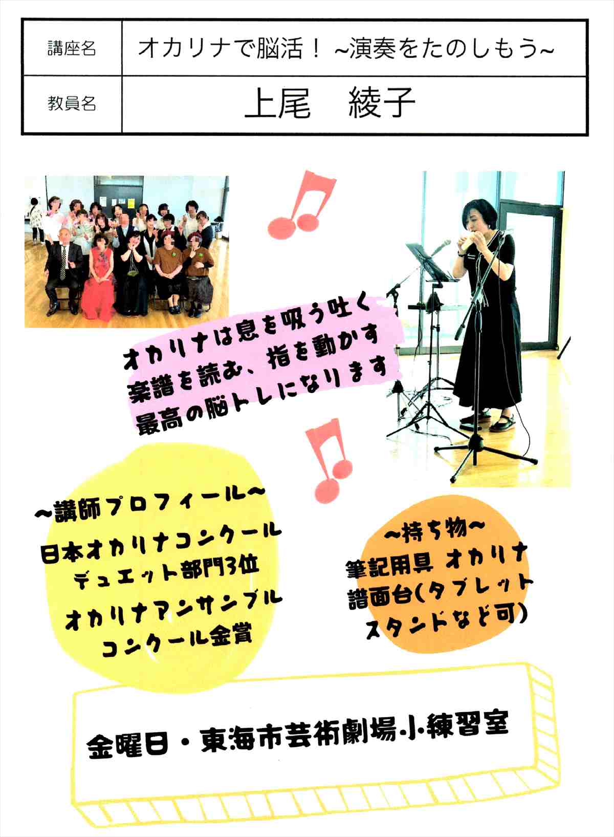 | 72 | オカリナで脳活!~演奏をたのしもう~ | 上尾綾子 | 4/17・5/15・5/29・6/5・6/19・7/3・8/7・8/21・9/4・9/18 | 金 | 10:00~11:30 | 芸劇 | 10 | B | ¥700 | 20 |