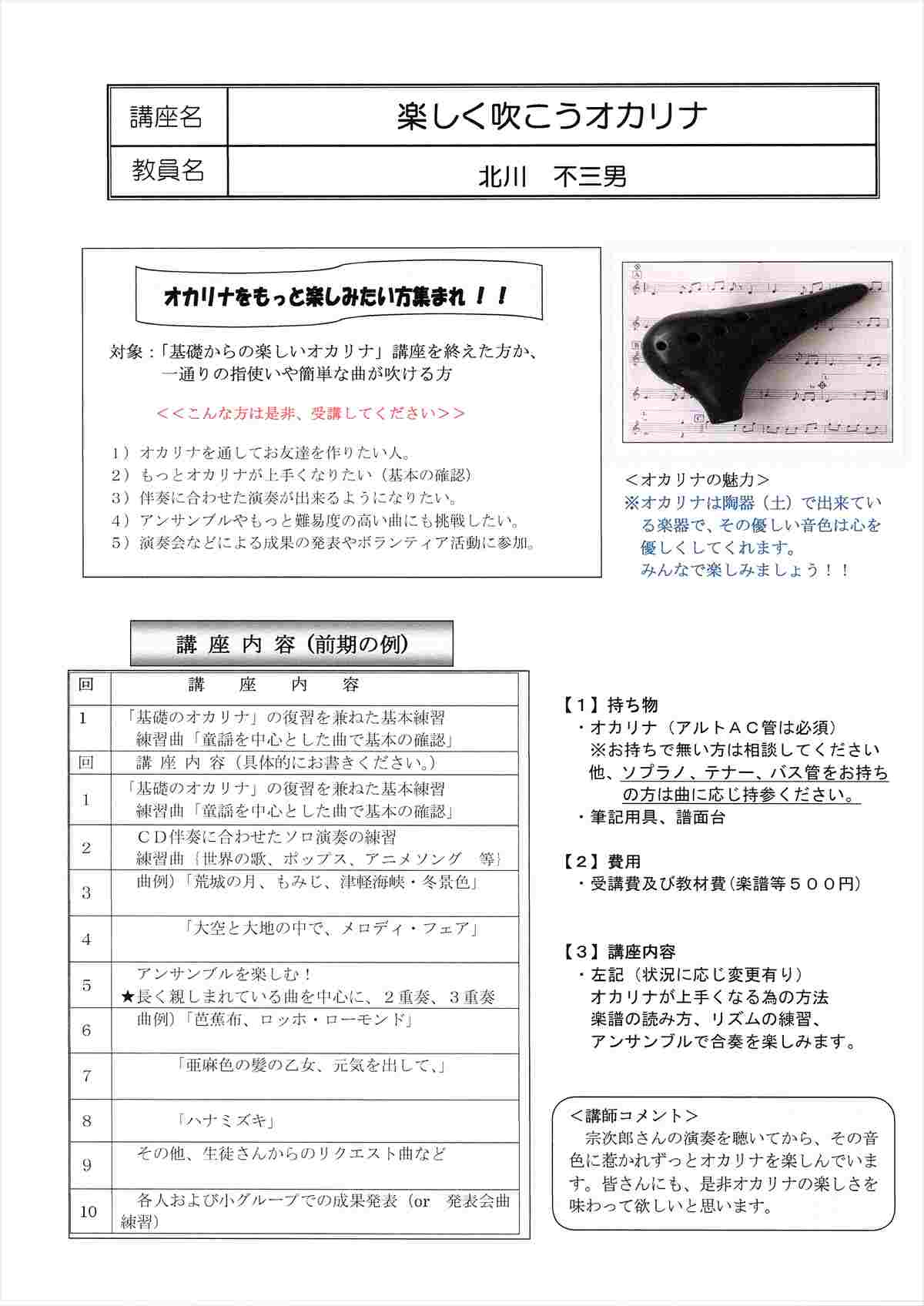 | 73 | 楽しく吹こうオカリナ | 北川不三男 | 4/11・4/25・5/9・5/23・6/13・6/27・7/11・7/25・8/22・9/12 | 土 | 10:00~11:30 | し村 | 10 | BC | ¥500 | 20 |