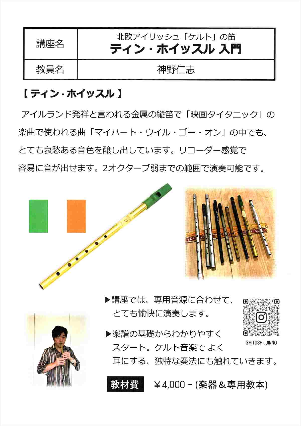 | 74 | 北欧アイリッシュ「ケルト」の笛 ティン・ホイッスル 入門 | 神野仁志 | 4/14・4/28・5/12・5/26・6/9・6/23・7/14・7/28・8/25・9/8 | 火 | 15:20~16:50 | 芸劇 | 10 | AB | ¥4,000 | 20 |