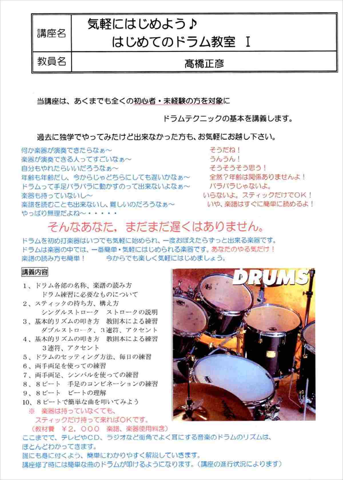| 75 | 気軽にはじめよう♪はじめてのドラム教室Ⅰ | 髙橋正彦 | 4/7・4/21・5/19・6/2・6/16・6/30・7/7・8/4・8/18・9/1 | 火 | 19:00~20:30 | 上公 | 10 | AB | ¥2,000 | 10 |
