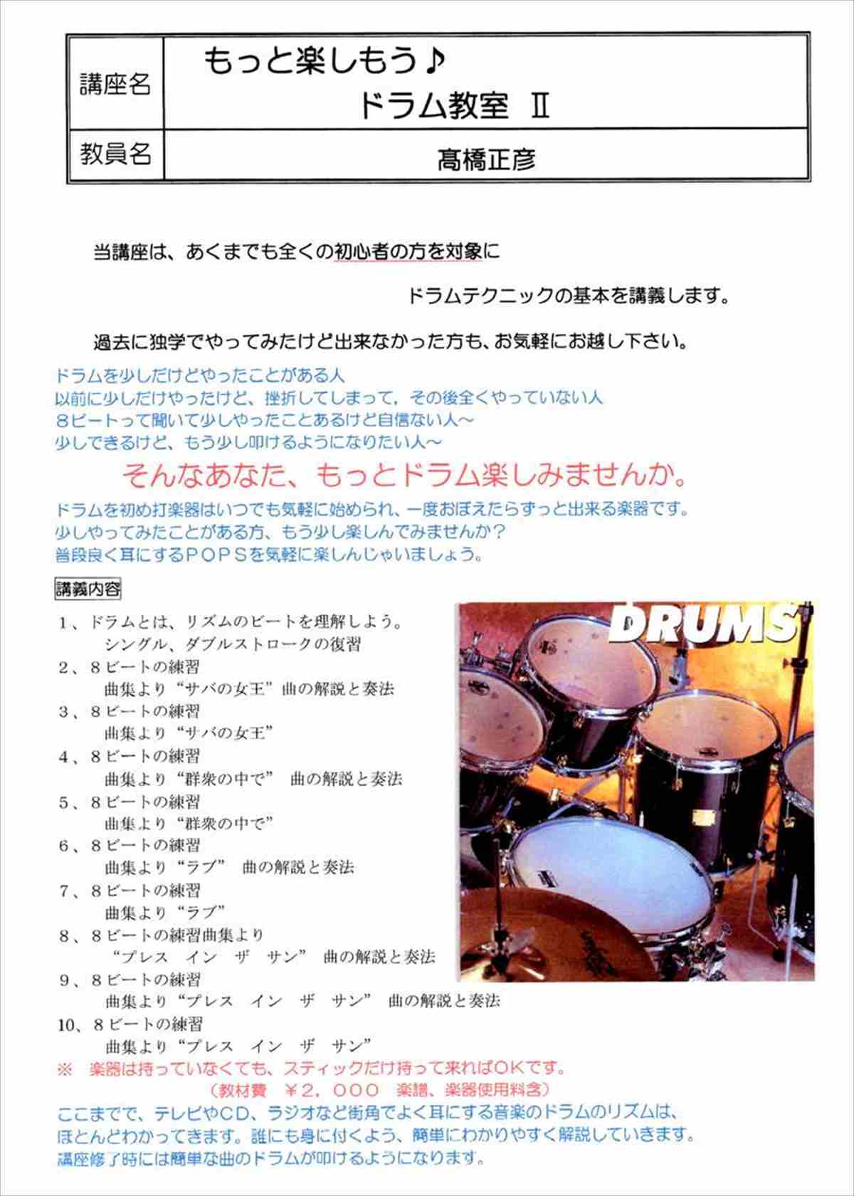 | 76 | もっと楽しもう ドラム教室Ⅱ | 髙橋正彦 | 4/14・4/28・5/12・5/26・6/9・6/23・7/14・7/28・8/25・9/8 | 火 | 19:00~20:30 | 上公 | 10 | B | ¥2,000 | 10 |
