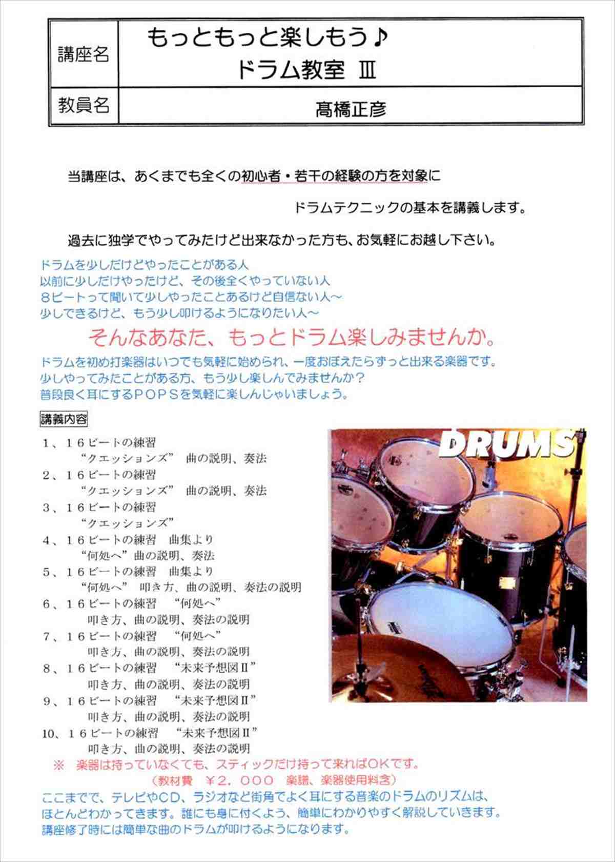 | 77 | もっともっと楽しもう ドラム教室Ⅲ | 髙橋正彦 | 4/17・5/15・5/29・6/5・6/19・7/3・7/17・8/7・8/21・9/4 | 金 | 19:00~20:30 | 上公 | 10 | BC | ¥2,000 | 10 |